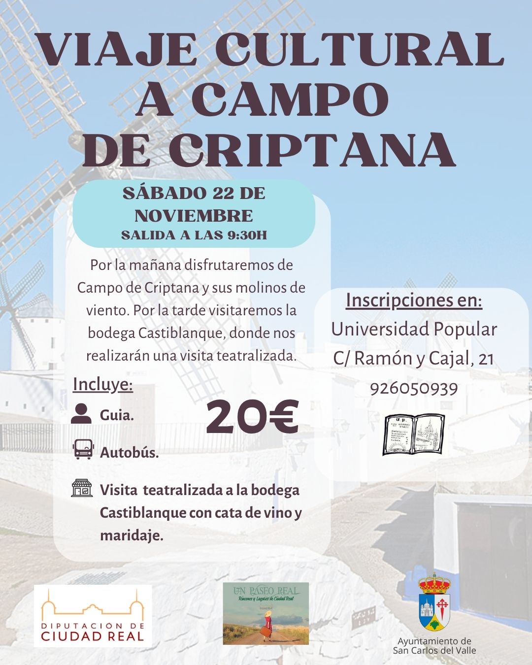 La Universidad Popular organiza un viaje a Campo de Criptana para el sábado 22 de noviembre. Se realizará una visita teatralizada a la bodega de Castiblanque, con cata de vino y maridaje. Las inscripciones se pueden realizar en la oficina de la Universidad Popular.