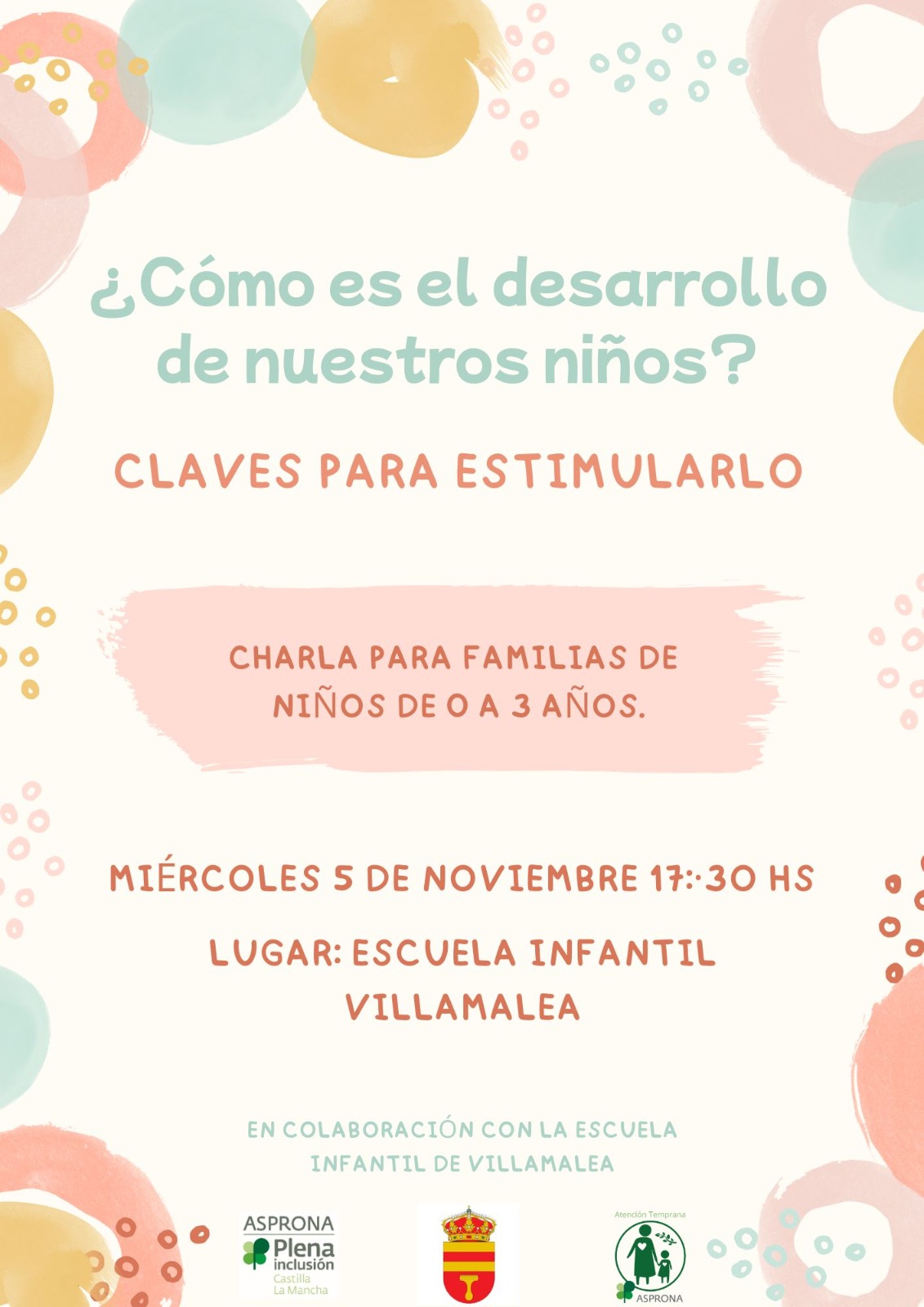 El próximo día 5 de noviembre os invitamos a venir a una charla informativa sobre el desarrollo de los niños de 0-3 años donde se presentará,. además, el servicio de Atención Temprana. Si estáis interesados, os esperamos en la Escuela Infantil Municipal de Villamalea.