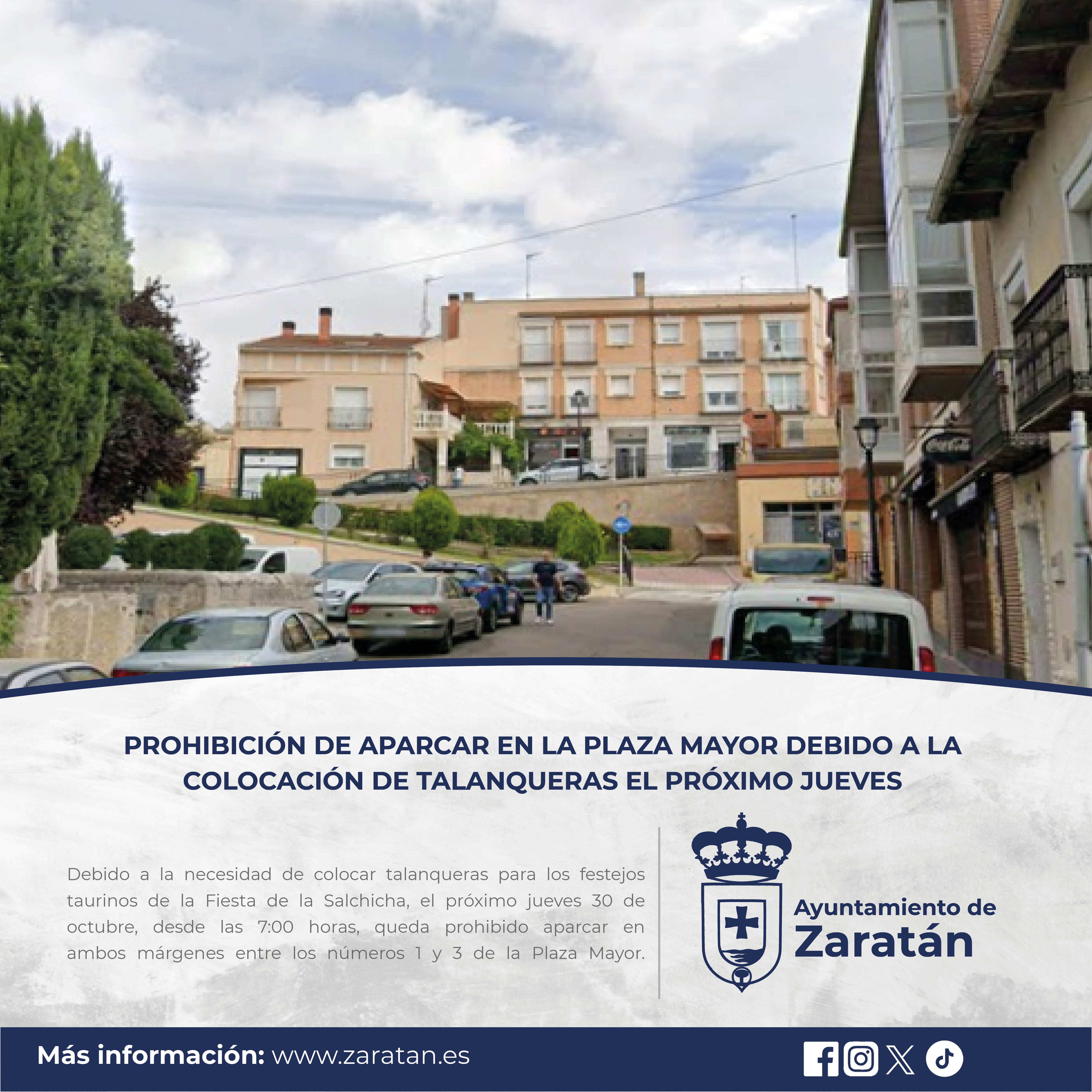 Debido a la necesidad de colocar talanqueras para los festejos taurinos de la Fiesta de la Salchicha, el próximo jueves 30 de octubre, desde las 7:00 horas, queda prohibido aparcar en ambos márgenes entre los números 1 y 3 de la Plaza Mayor.