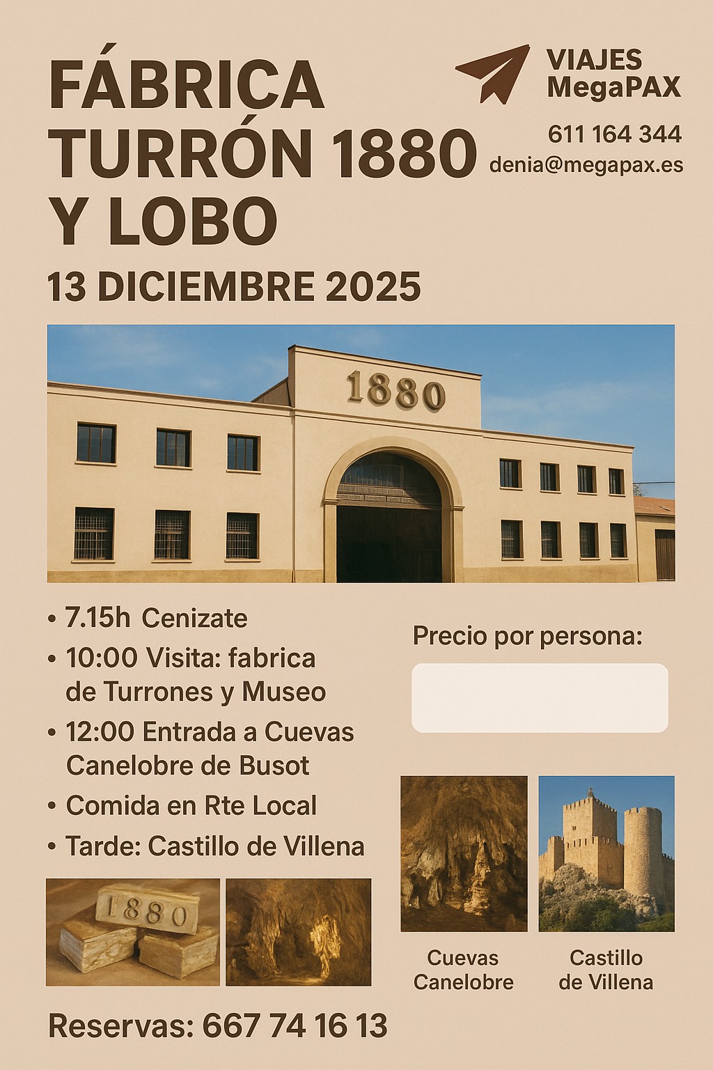 La asociación de mujeres Atenea organiza un viaje el 13 de diciembre a la Fábrica de Turrón "1880" y "El Lobo" (Villena) y a las Cuevas del Canelobre (Busot). Salida desde la parada del autobús a las 7:15 h. El viaje incluye autobús, visitas, comida concertada en restaurante (55 € socias, 60 € no soci@s). Inscripciones hasta el 1 de diciembre pagando a cualquiera de la Directiva.