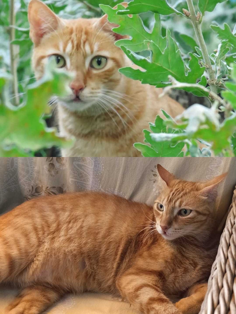 Es un gato grande de color naranja y atigrado. Es algo asustadizo, así que puede estar escondido o refugiado en algún corral o patio.