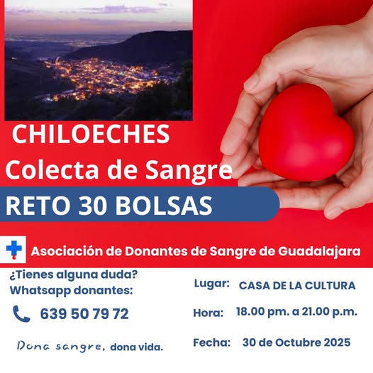 💉 La Asociación de Donantes de Sangre de Guadalajara realizará una visita a Chiloeches para colectar sangre.