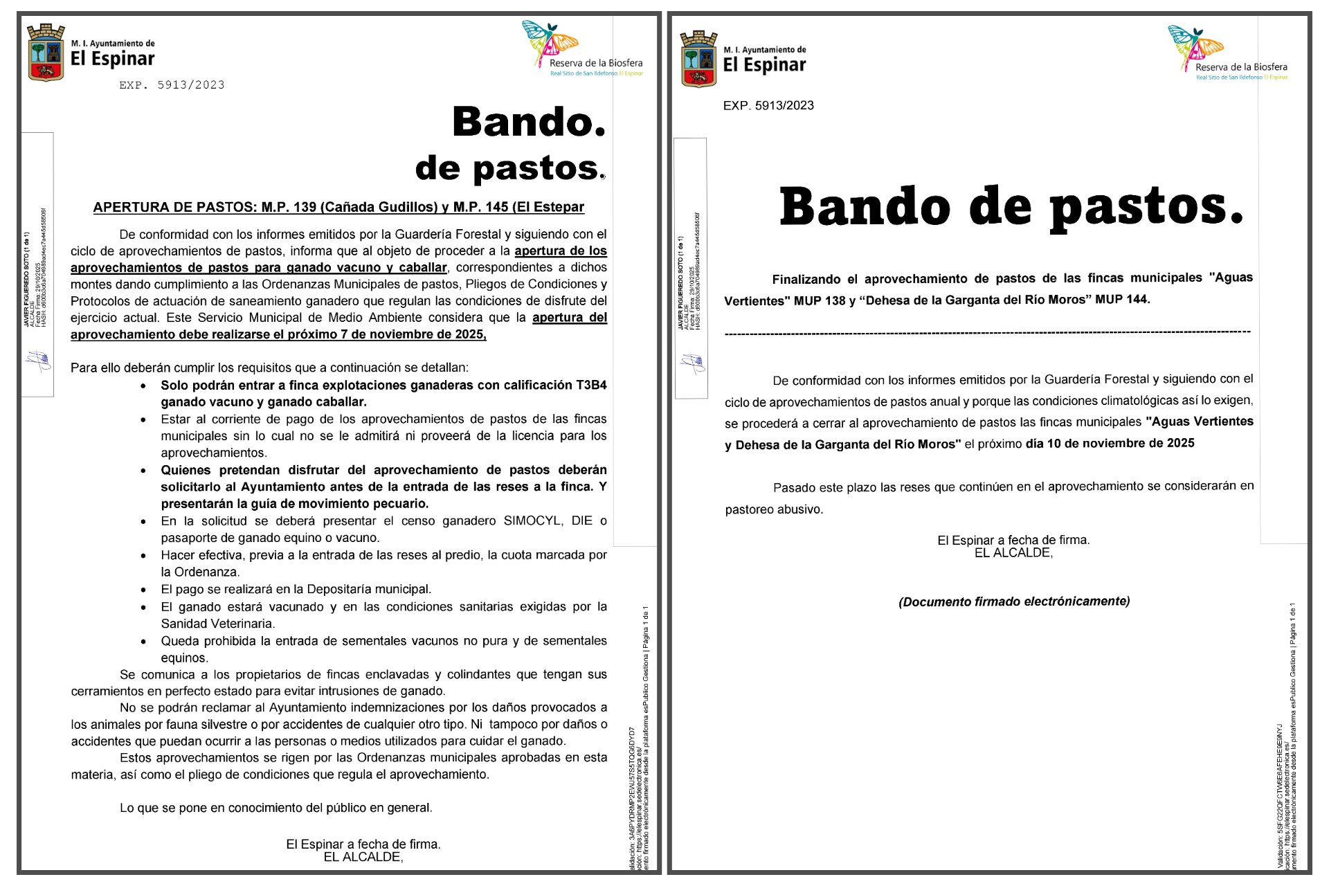 Se informa de los diferentes bandos de pastos publicados hoy: