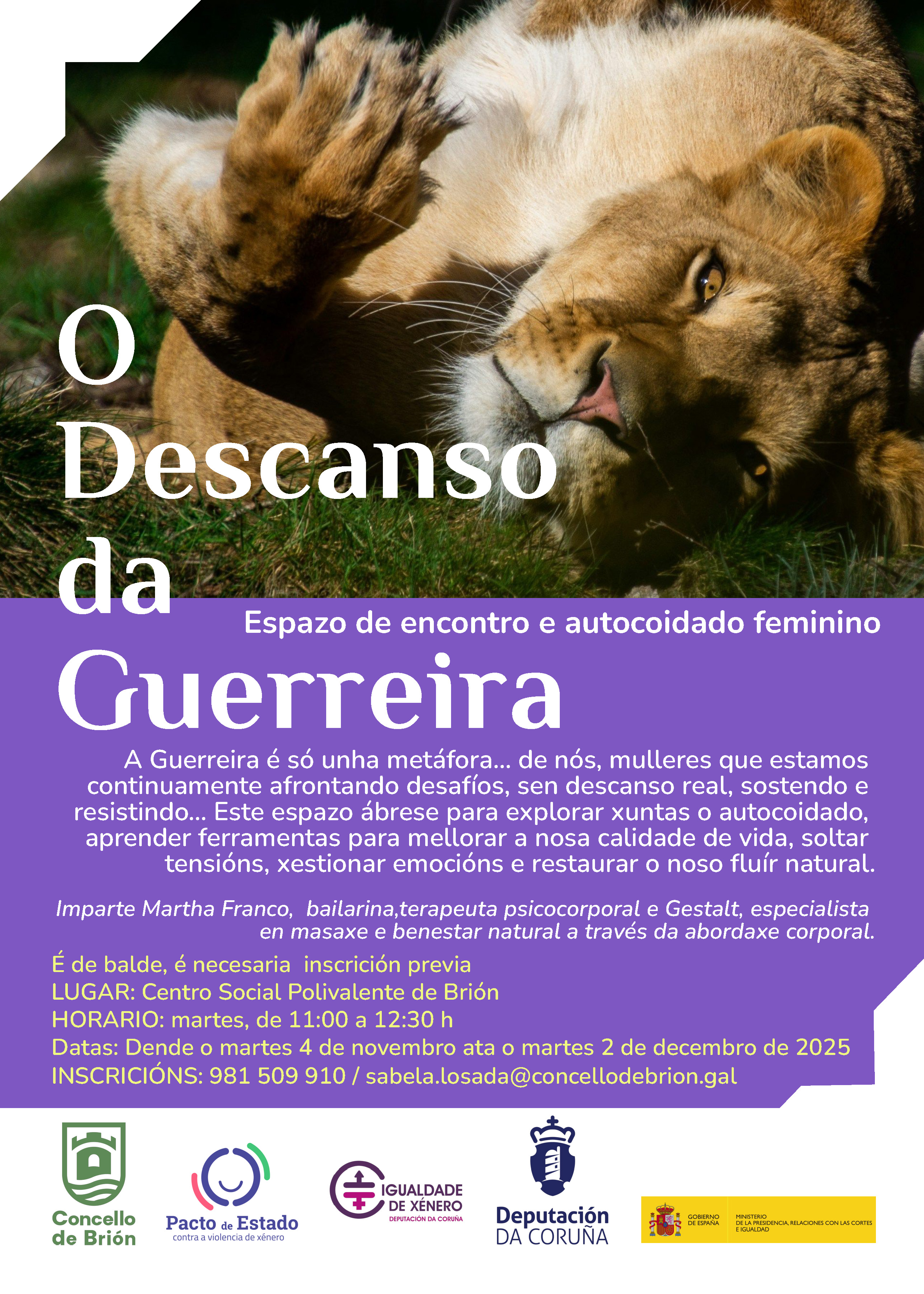 O Concello de Brión convida ás mulleres a participar no obradoiro “O descanso da guerreira”, un espazo de conexión feminina e autocoidado impartido pola bailarina e terapeuta Martha Franco. A actividade, que forma parte da programación arredor do 25 de novembro, Día Internacional da Eliminación da Violencia contra as Mulleres, celebrarase en cinco sesións semanais a partir do martes 4 de novembro, de 11:00 a 12:30 horas, no Centro Social Polivalente.