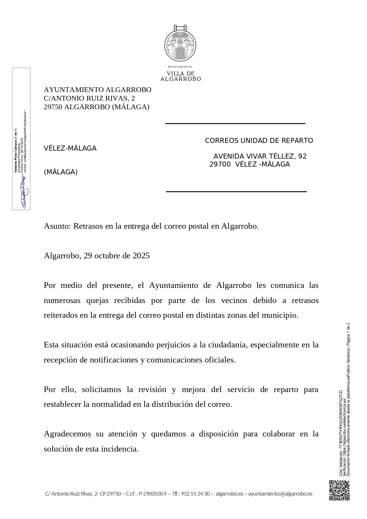 La alcaldesa, Natacha Rivas Campos, ha solicitado formalmente a la Unidad de Reparto de Vélez-Málaga una revisión y mejora del servicio, con el objetivo de restablecer la normalidad en el reparto del correo y garantizar un servicio eficaz para todos los vecinos 🤝📫.