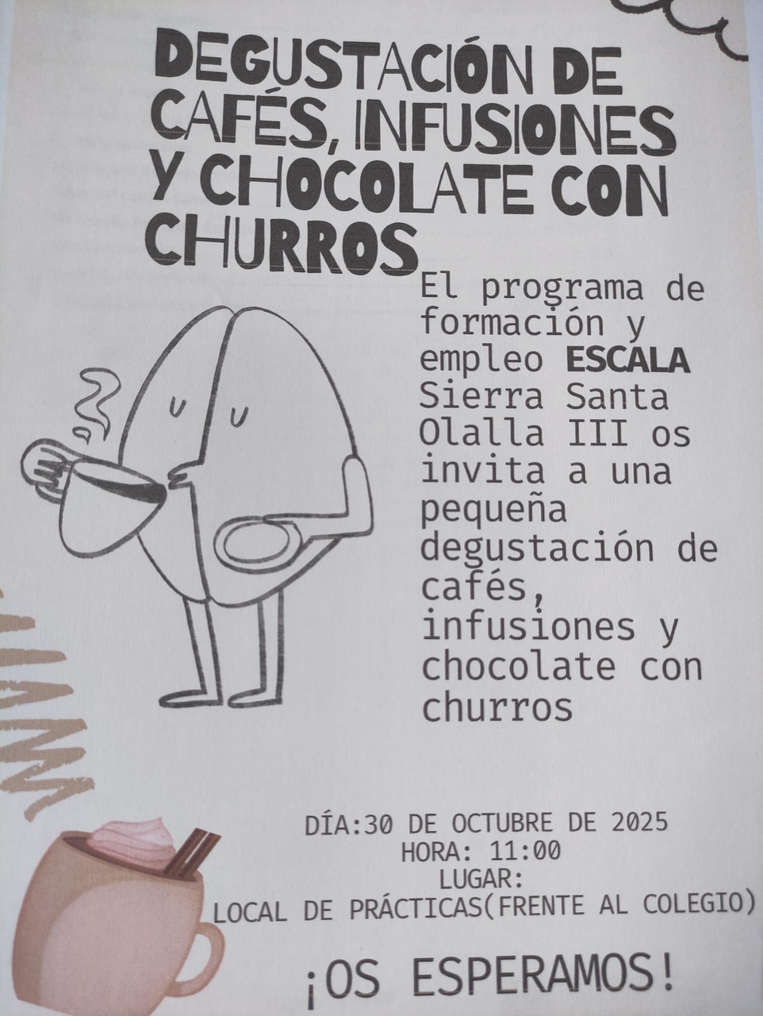 HOY JUEVES DÍA 30 DE OCTUBRE SE LLEVARÁ A CABO UNA DEGUSTACIÓN DE CAFÉS, INFUSIONES Y CHOCOLATE CON CHURROS PARA TODAS LAS PERSONAS QUE QUIERAN ACUDIR.