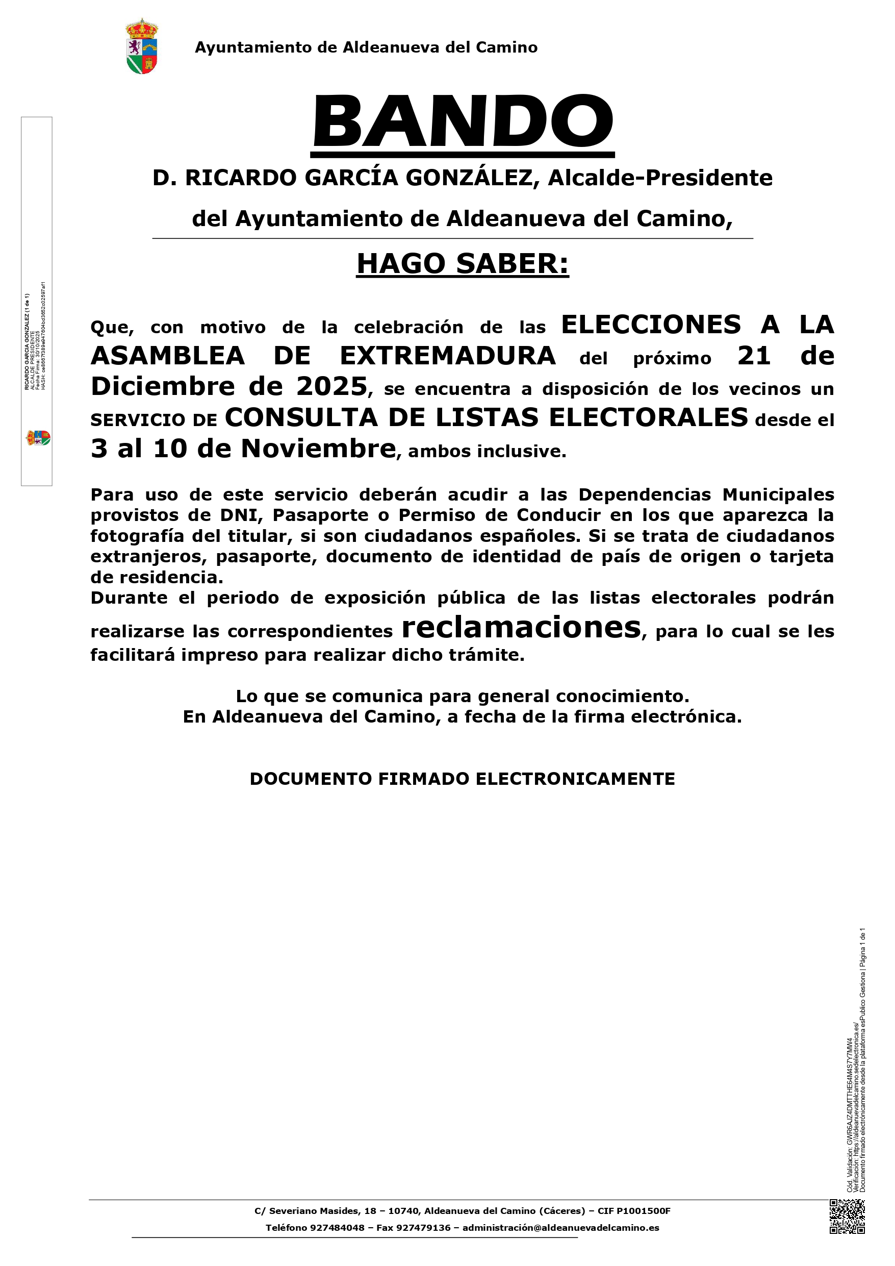 En cartelerĂa adjunta se informa sobre el plazo de consulta del censo electoral para las elecciones a la asamblea de extremadura 2025