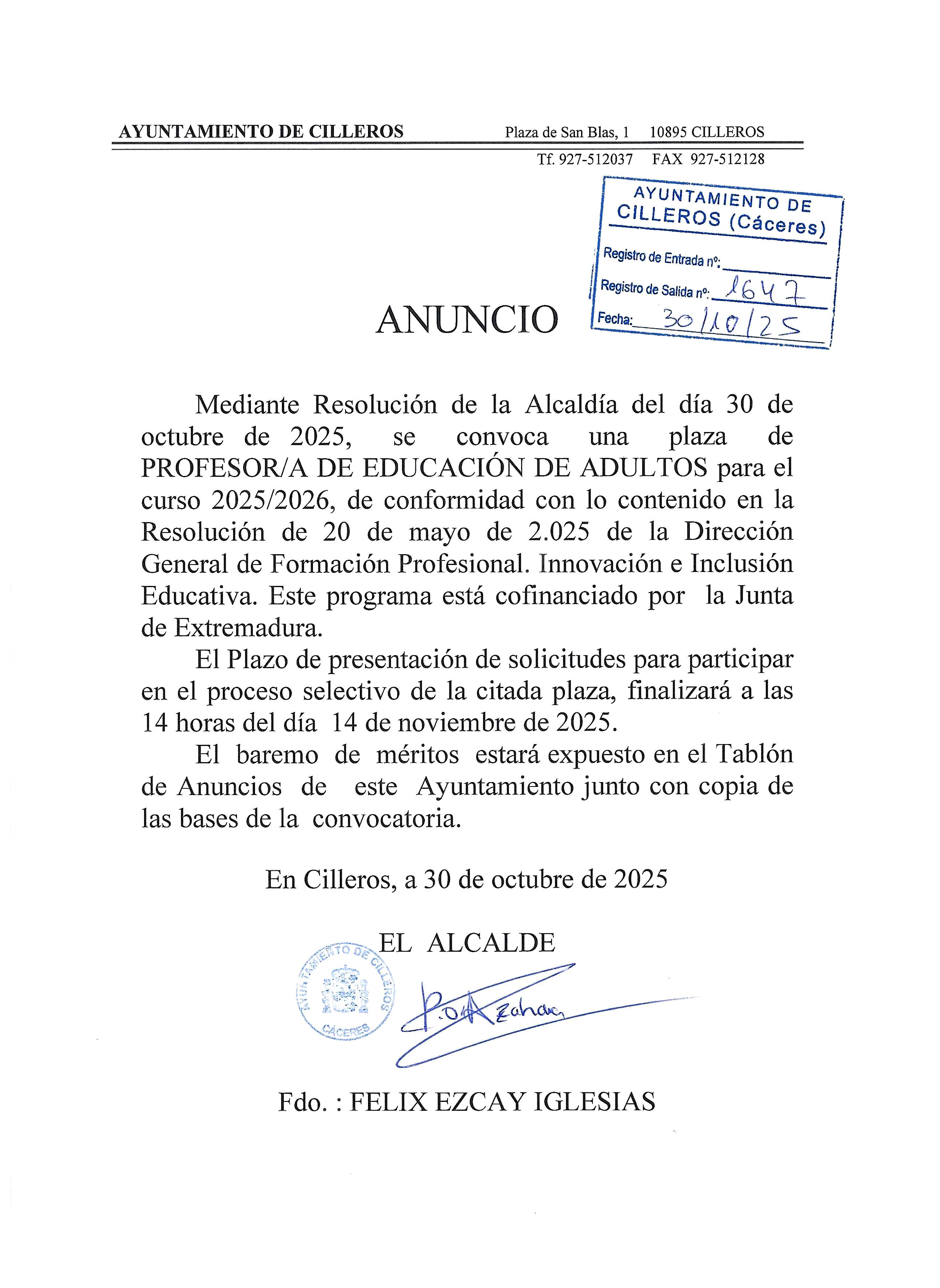 SE CONVOCA UNA PLAZA DE PROFESOR/AR DE EDUCACIÓN DE ADULTOS PARA EL CURSO 2025/2026