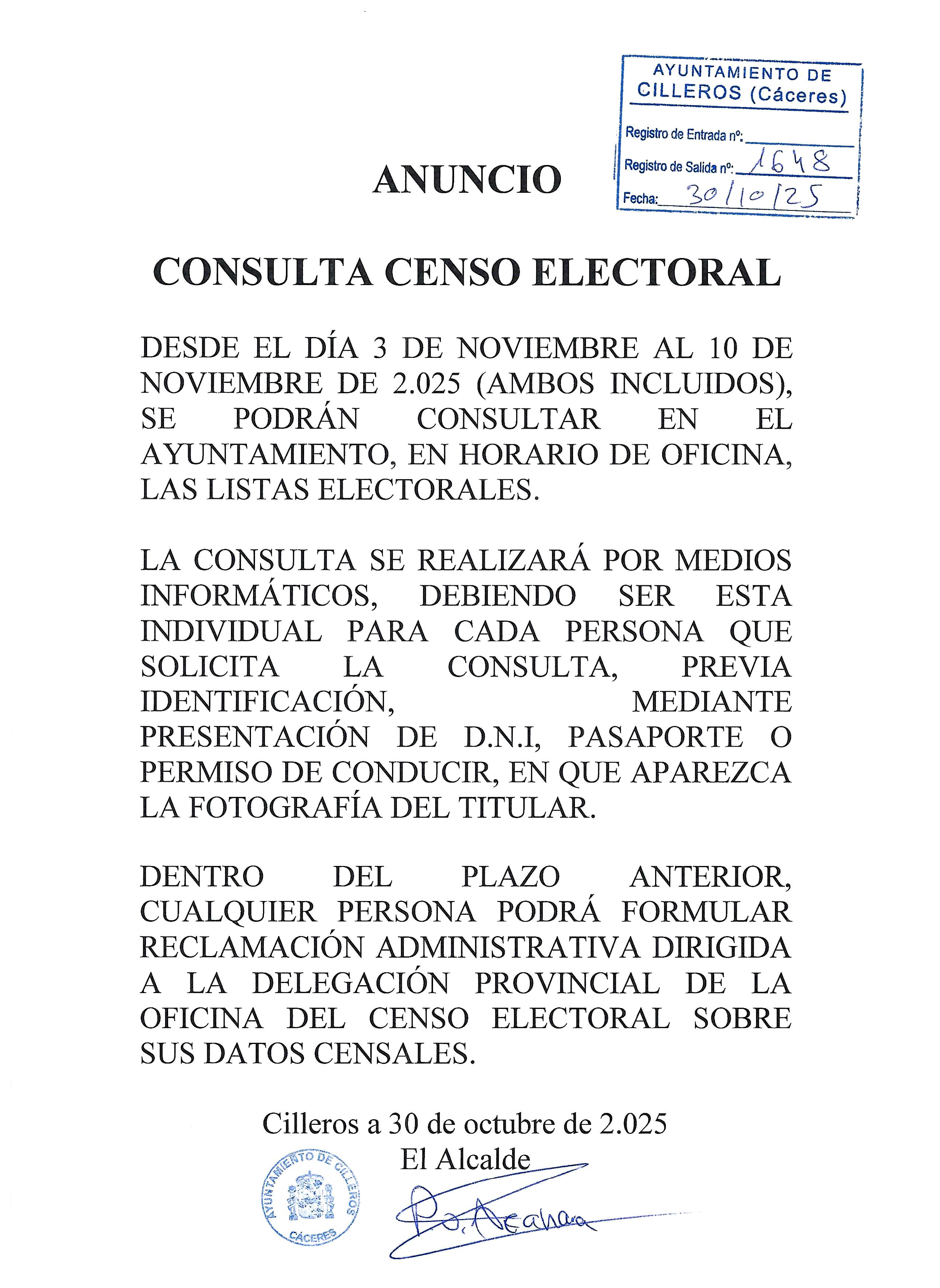 SE INFORMA QUÉ DESDE EL DÍA 3 DE NOVIEMBRE AL 10 DE NOVIEMBRE DE 2025( AMBOS INCLUIDOS), SE PODRÁN CONSULTAR LAS LISTAS ELECTORALES EN EL AYUNTAMIENTO. EN HORARIO DE 8:30H A 14:30H
