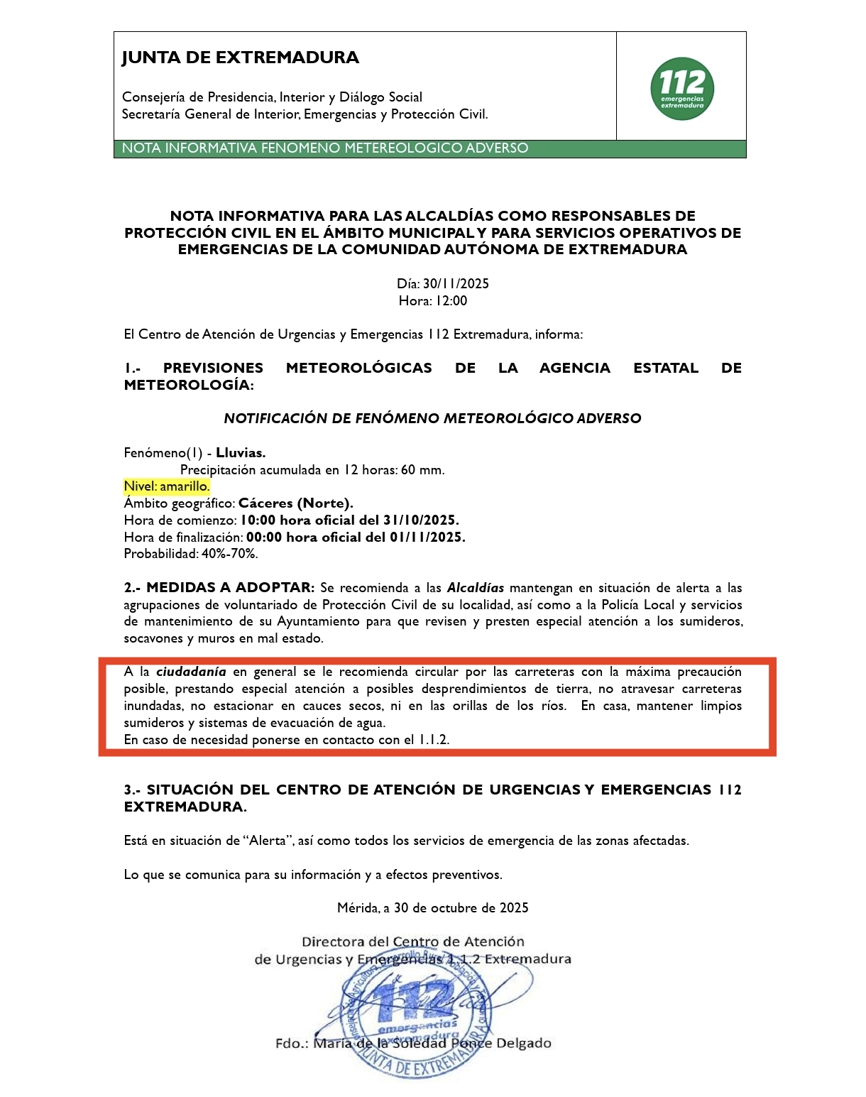 ⛈️⚠️Alerta Amarilla por lluvias en el Norte de Cáceres 📆 Viernes 31 de octubre desde las 10:00 horas hasta las 00:00h del 1 de noviembre.☎️ 112 Emergencias