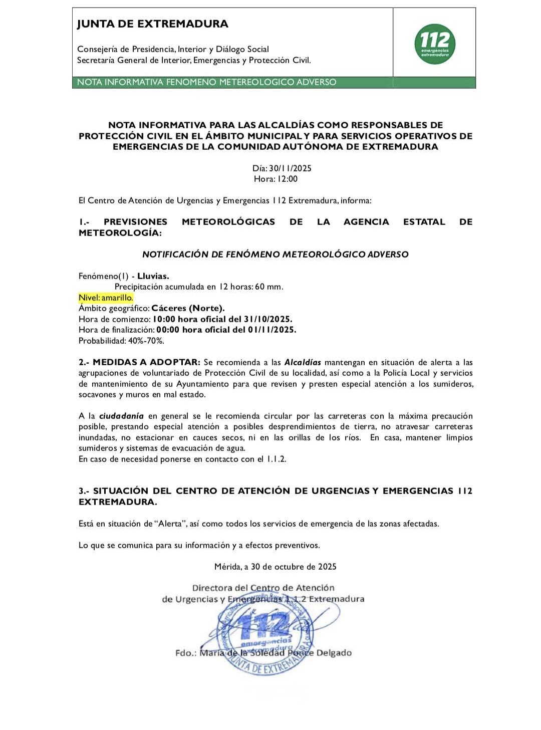 ⚠️⚠️⚠️Alerta Amarilla por lluvias⚠️⚠️⚠️Extremen las precauciones oportunas y cualquier incidencia no emergencia, 📞llamen al 1️⃣1️⃣2️⃣Se adjunta archivo con comunicación Junta de Extremadura y 112