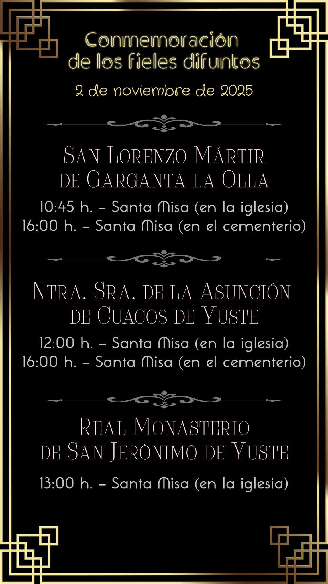 - Domingo, 2 de noviembre de 2025, 13:00 h: Eucaristía en la Iglesia del Real Monasterio San Jerónimo de Yuste.