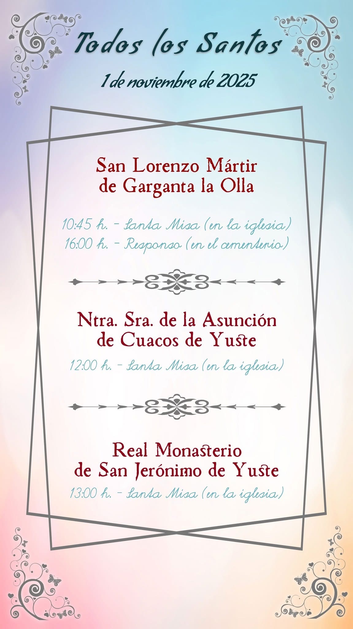 - Sábado, 1 de noviembre de 2025, 13:00 h: Eucaristía en la Iglesia del Real Monasterio de Yuste.