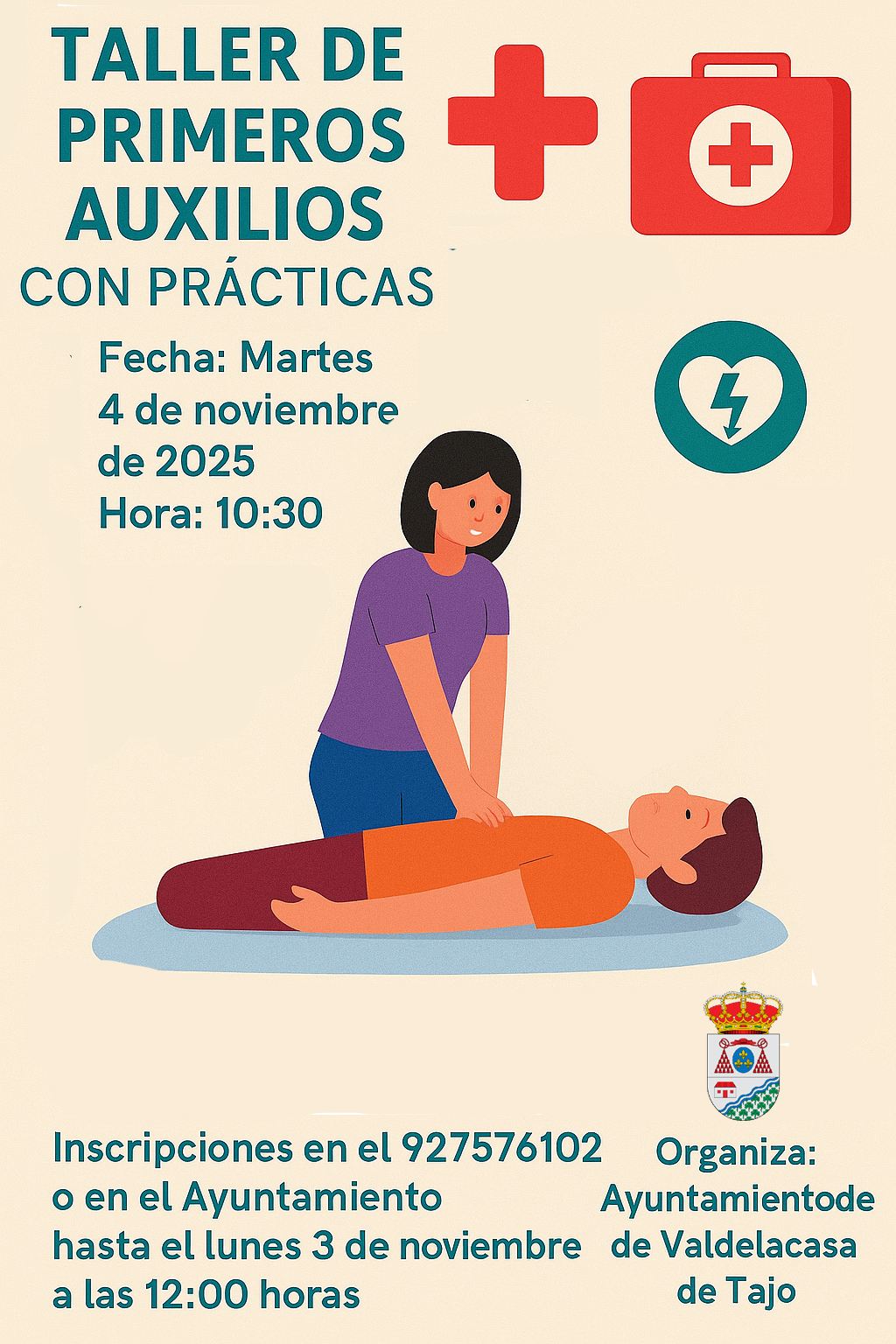 Se adjunta cartel del taller de primeros auxilios que se realizará el próximo día 4 de noviembre a las 10:30 horas en la biblioteca.