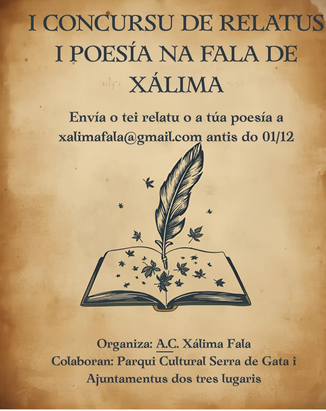 A Associación Cultural Xálima Fala, juntu con us Aiuntamentus de Valverdi du Fresnu; As Ellas; San Martín de Trevellu, y u Parqui Cultural Serra de Gata da Diputación Provincial de Cáceres, convoca u PRIMEIRU CONCURSU DE RELATUS I POESÍA EN FALA con u fin de promocional y difundil a proposta de fala de nosa lengua.