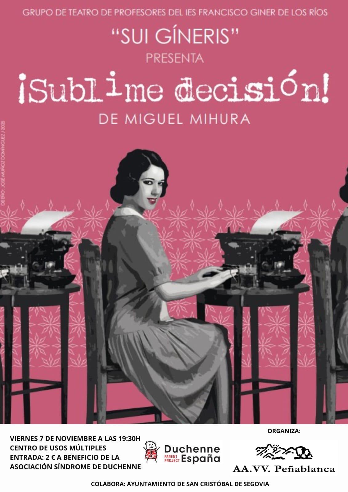 Este viernes 7 de noviembre a las 19:30h, el Grupo de Teatro de Profesores del IES Francisco Giner de los Ríos presenta la divertida comedia "¡Sublime decisión!" de Miguel Mihura, bajo la dirección de Sui Géneris.