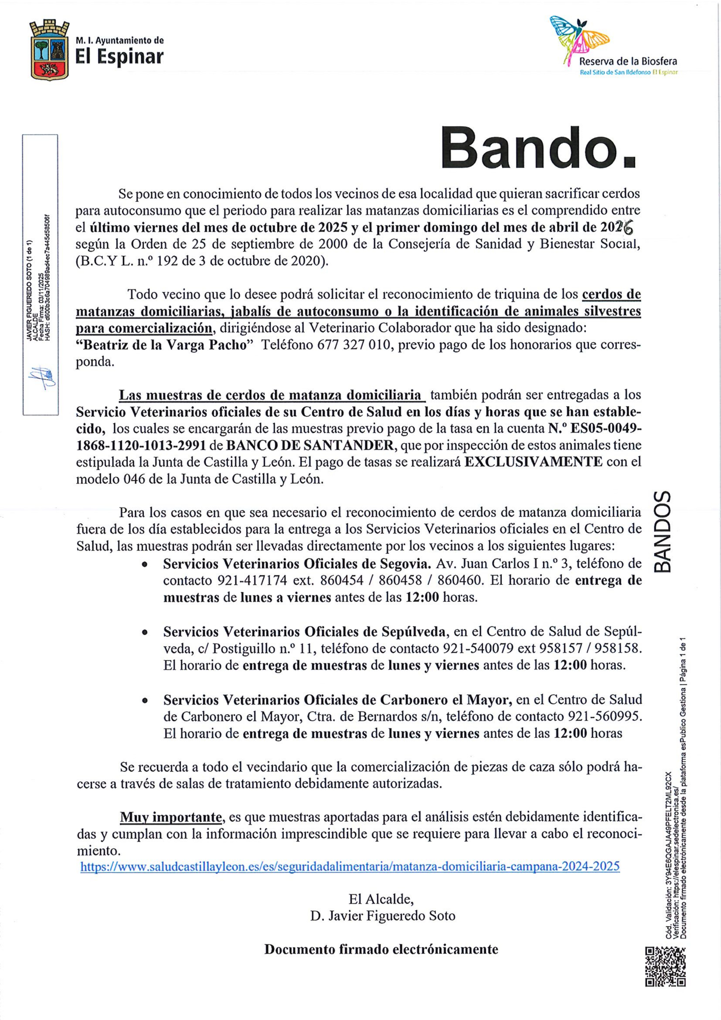Se informa a los vecinos que el periodo para realizar matanza domiciliaria de cerdos para autoconsumo será entre el último viernes de octubre de 2025 y el primer domingo de abril de 2026.