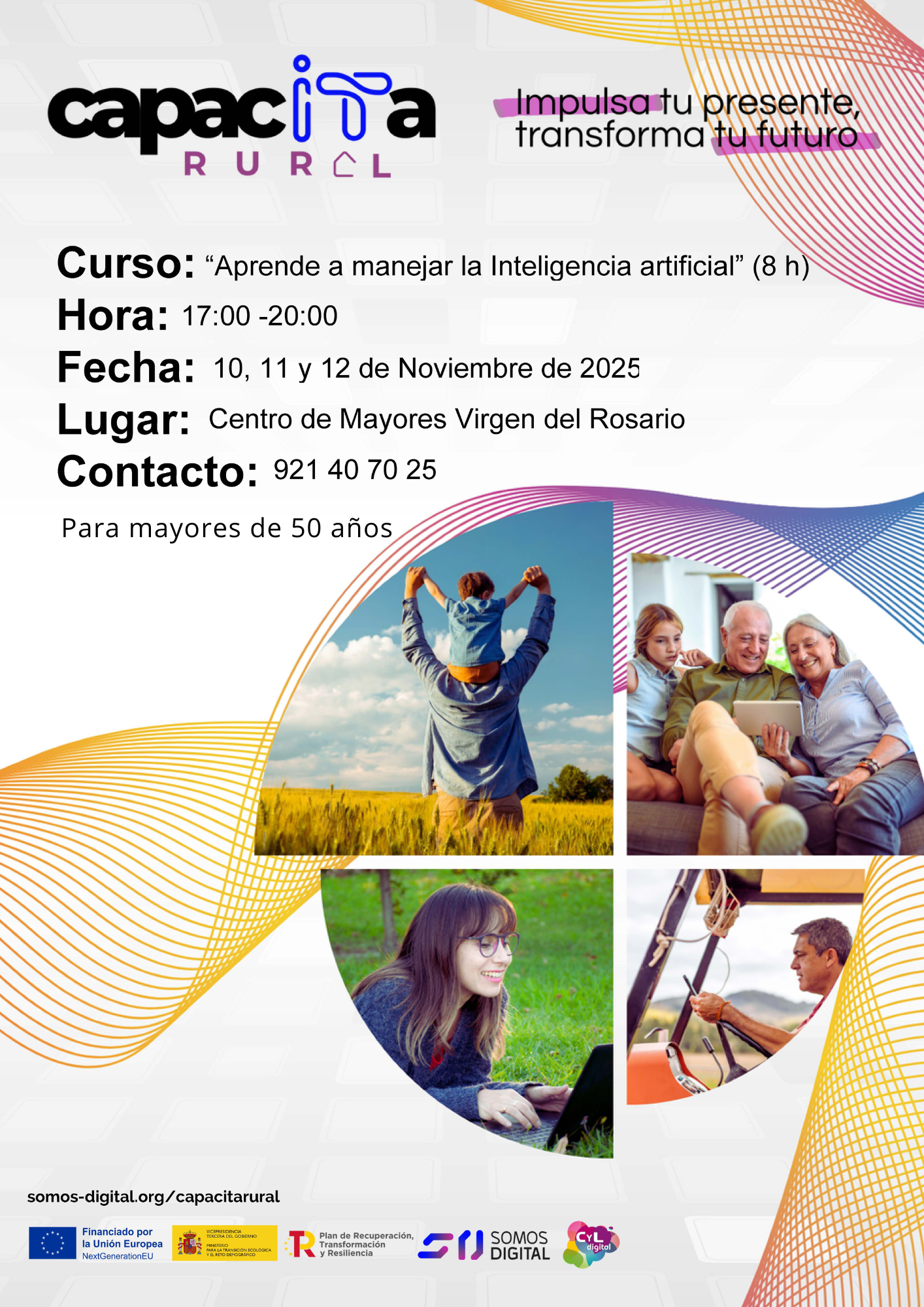 ¿Tienes más de 50 años y quieres estar al día con las nuevas tecnologías? El Ayuntamiento te invita al curso gratuito "Aprende a manejar la Inteligencia Artificial". No necesitas experiencia previa, solo ganas de aprender y transformar tu futuro 🚀