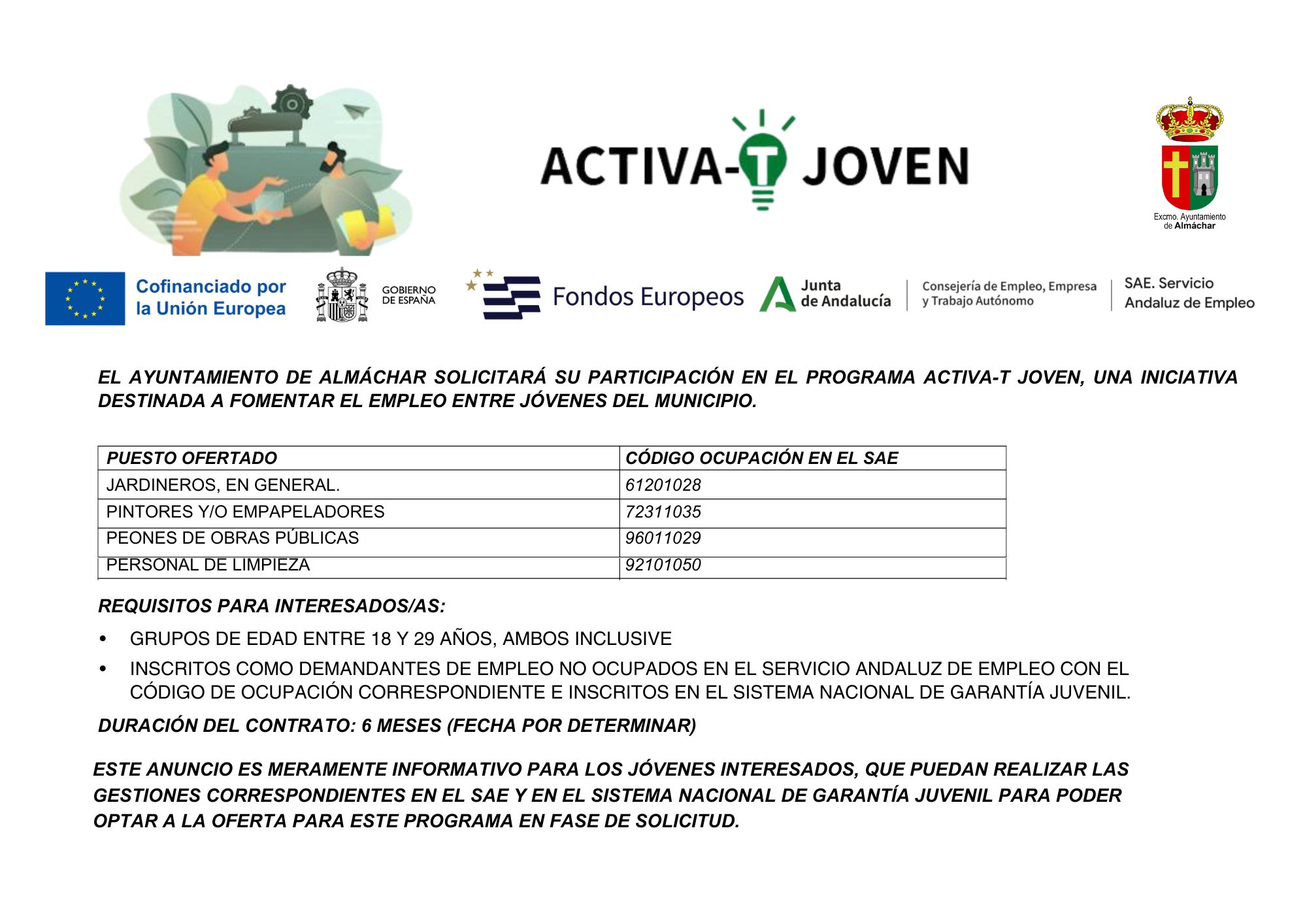 El Ayuntamiento de Almáchar solicitará su participación en el programa ACTIVA-T JOVEN, una iniciativa destinada a fomentar el empleo entre jóvenes del municipio.