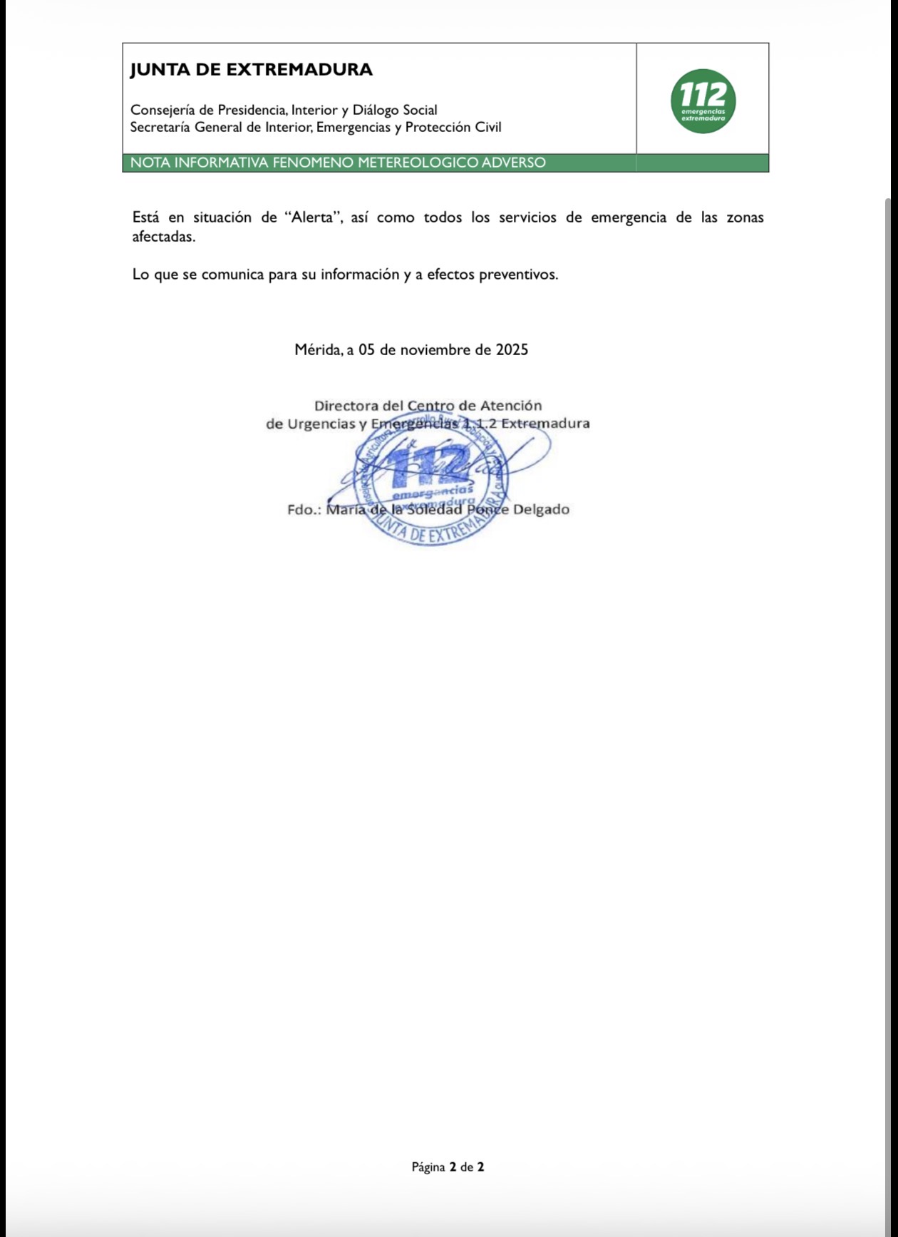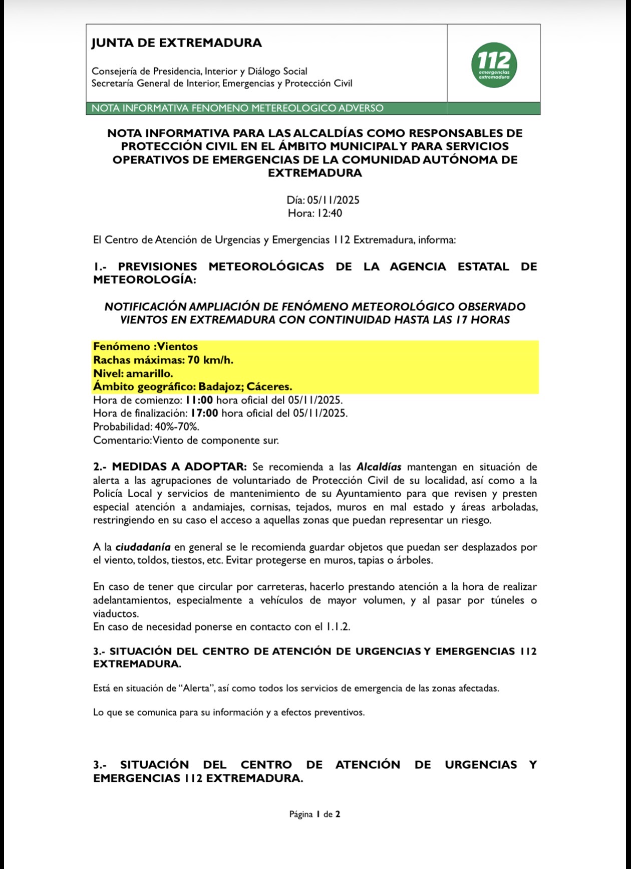 Alerta Meteorológica FMA VIENTOS OBSERVADO AEMET Ampliacion Nivel Amarillo por vientos toda Extremadura, 05/11/2025