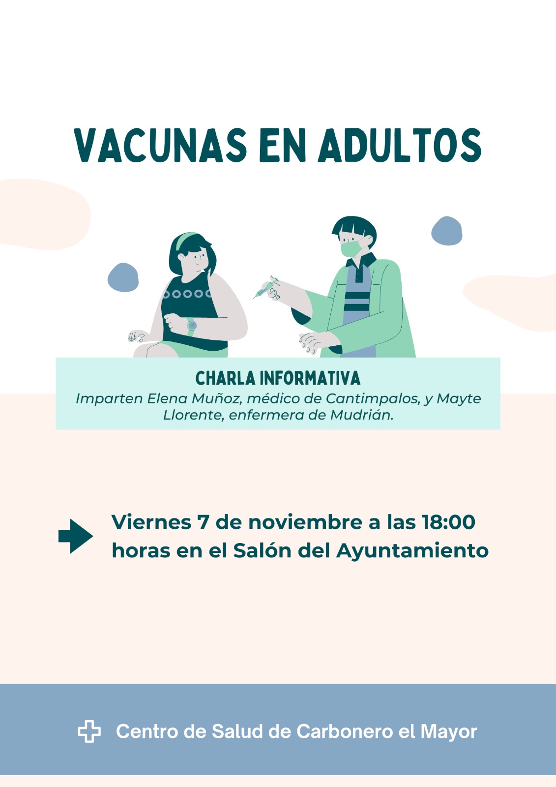 Este viernes 7 de noviembre a las 18:00 h en el Salón del Ayuntamiento, charla sobre vacunas en adultos con Elena Muñoz (médico de Cantimpalos) y Mayte Llorente (enfermera de Mudrián). Ven a informarte y resolver tus dudas.