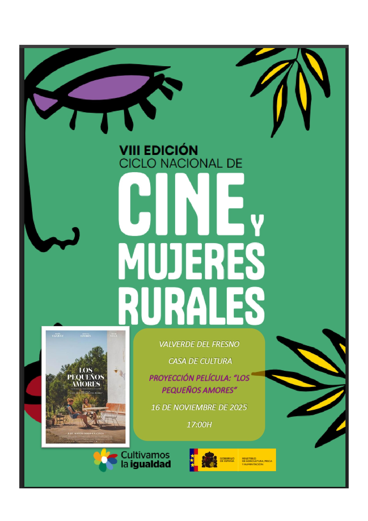 Se recuerda que hoy domingo 16 de noviembre, dentro de la VIII Edición del Ciclo de Cine de Mujeres Rurales, a las 17:00h, se proyectará en la Casa de Cultura la película "Los Pequeños Amores". Una película, donde el espacio rural es el protagonista, que explora los conflictos, los silencios, la soledad, la falta de comunicación y la dificultad para cumplir las expectativas que se depositan en la maternidad y la "hijidad" (ese rol que descubren las hijas en el momento en que se dan cuenta de la responsabilidad que también implica ser un poco la madre de sus madres).