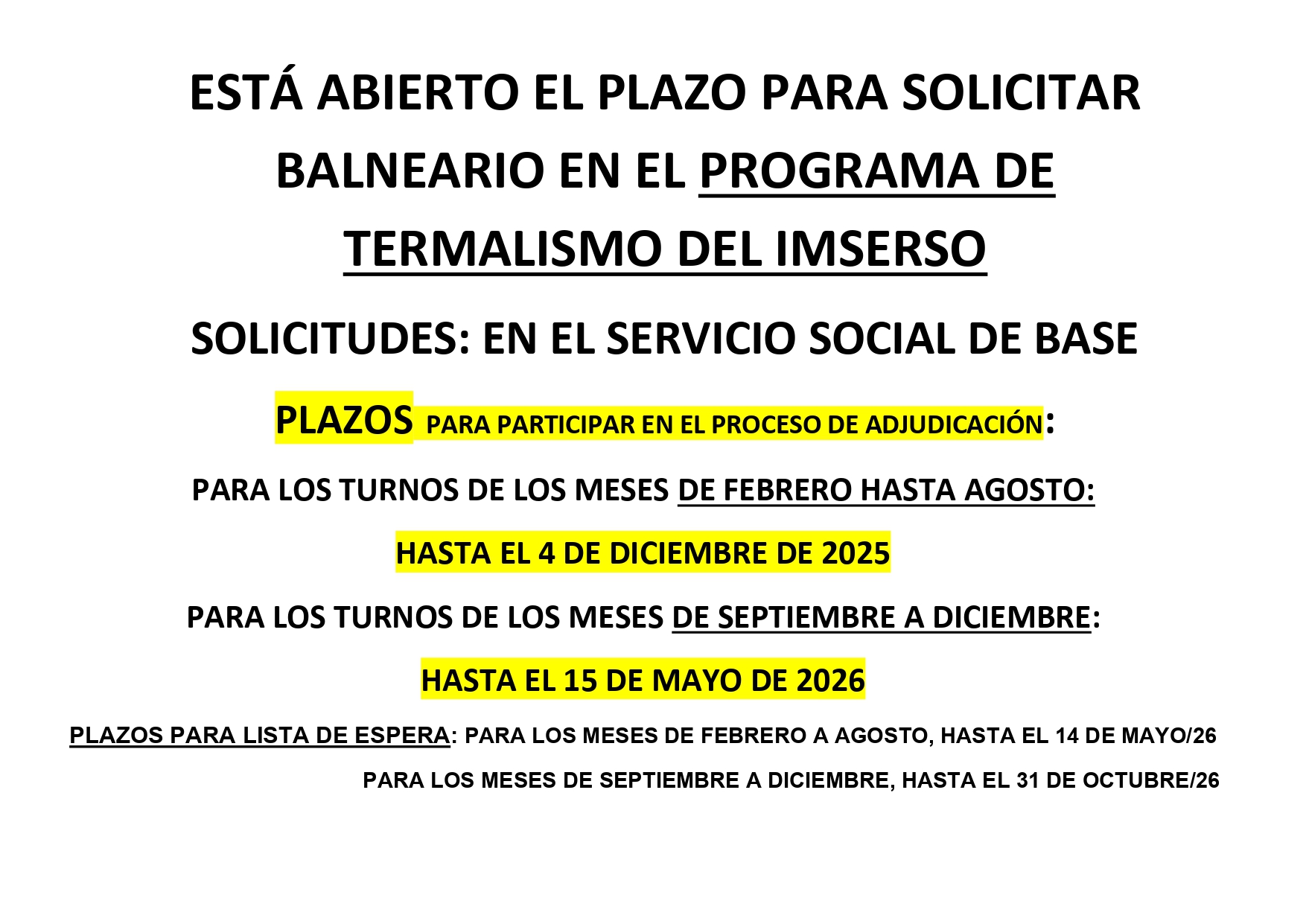 Se informa que ya está abierto el plazo para solicitar balneario en el Programa de Termalismo del IMSERSO 2026.