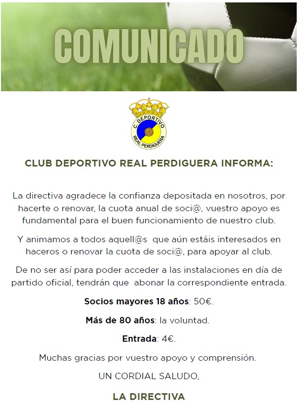 Además, se recuerda que quienes aún estén interesados en hacerse socios o renovar su cuota pueden hacerlo para seguir apoyando al club. En caso contrario, para acceder a las instalaciones en los días de partido oficial será necesario abonar la entrada correspondiente (4 €).