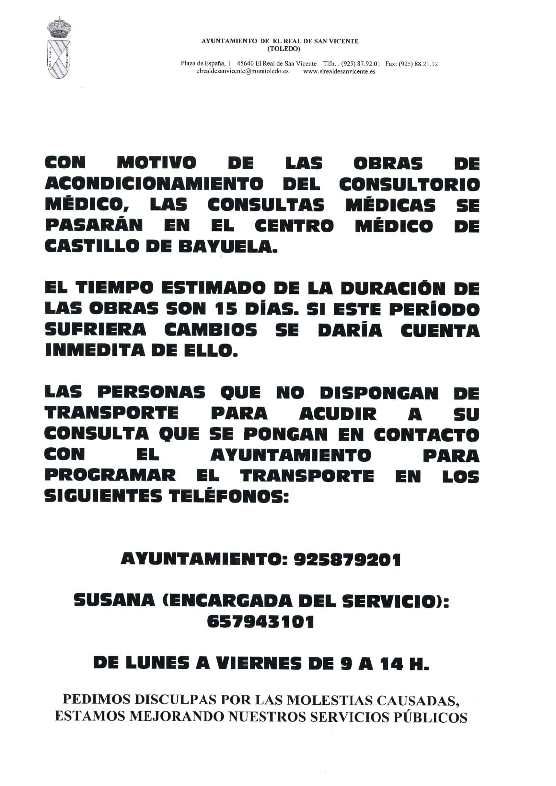 Mientras duren las obras del consultorio médico, las consultas se pasarán en Castillo de Bayuela. Si alguien tiene problemas de desplazamiento que se pongan en contacto con el Ayuntamiento en los siguientes teléfonos de lunes a viernes de 9 a 14 horas