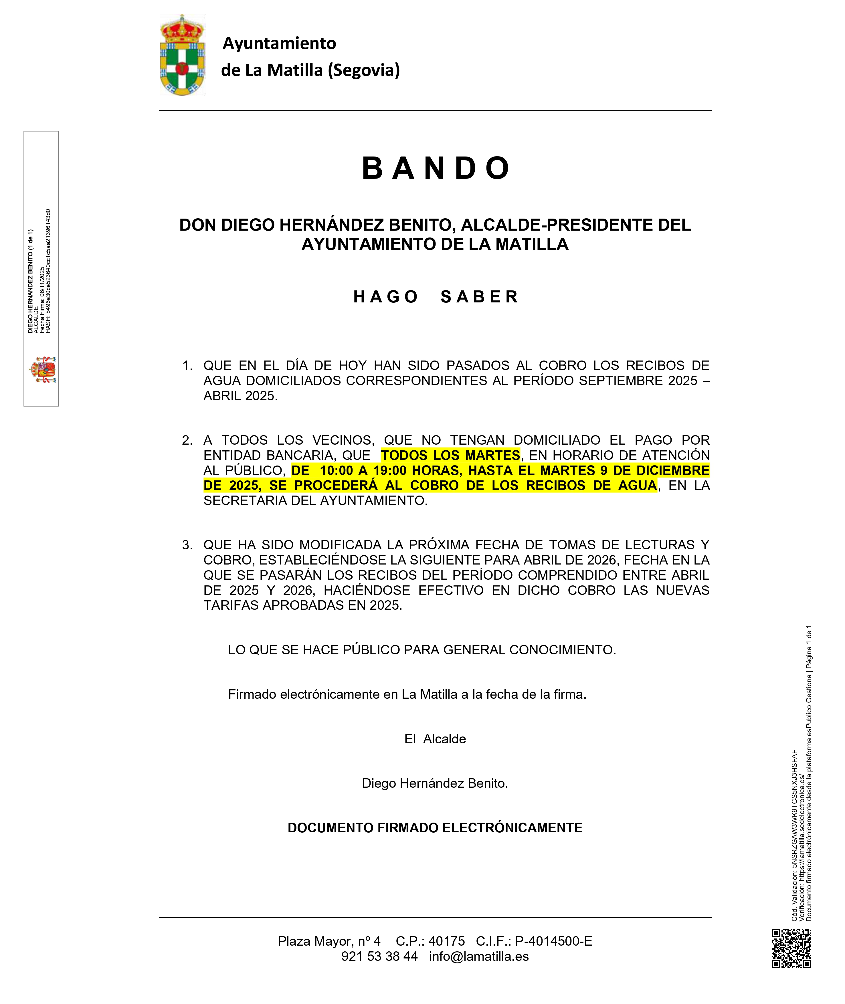 💁♀️ Si no lo tienes domiciliado, puedes abonar el recibo en el Ayuntamiento los martes, de 10:00 a 19:00 h, hasta el 9 de diciembre de 2025.