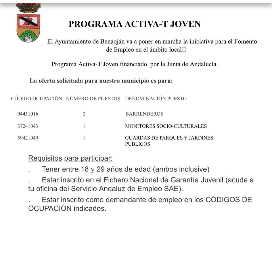 Queremos informar a nuestros vecinos que se va a poner en marcha el Programa Activa-T Joven para fomentar el empleo en el ámbito local.