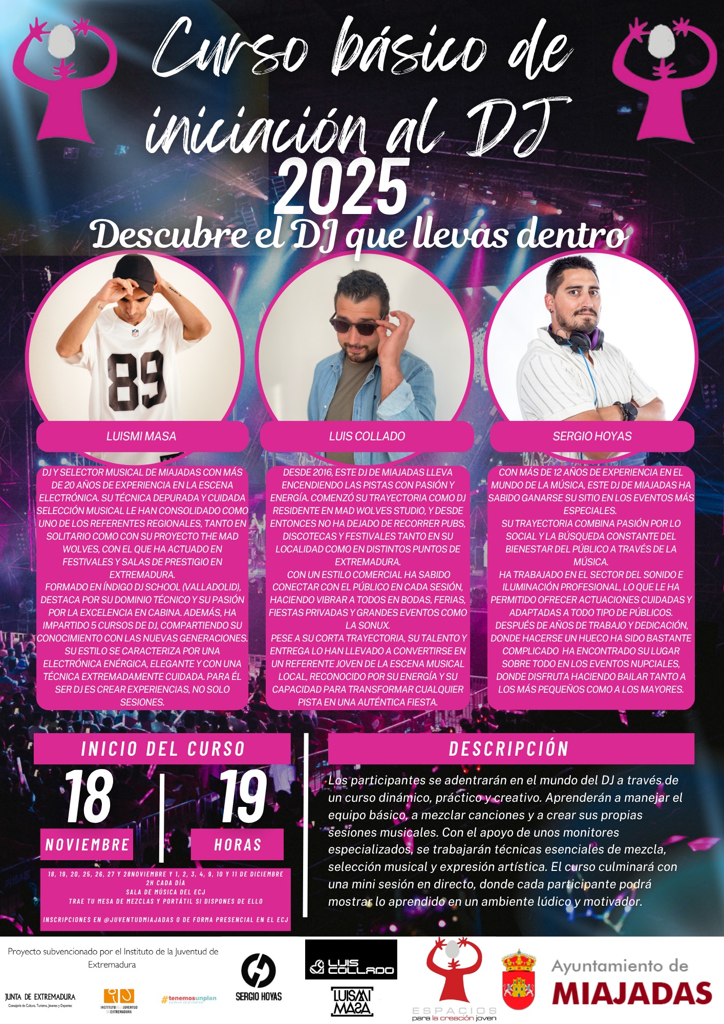 De la mano de tres cracks muy conocidos en nuestro pueblo, —Luismi, Luis y Sergio Hoyas—, aprenderás las bases del mundo DJ: mezcla, ritmo, técnica, creatividad,... ¡y mucho más!; además, ellos mismos os explicarán los contenidos del curso y sus horarios en la primera sesión.