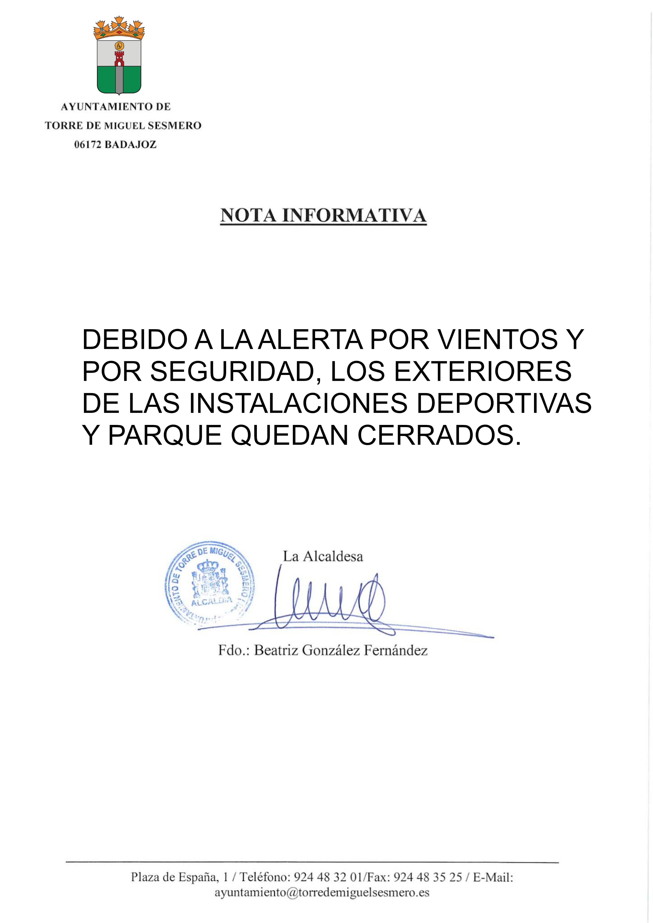 DEBIDO A LA ALERTA POR VIENTOS Y POR SEGURIDAD, LOS EXTERIORES DE LAS INSTALACIONES DEPORTIVAS Y PARQUE QUEDAN CERRADOS