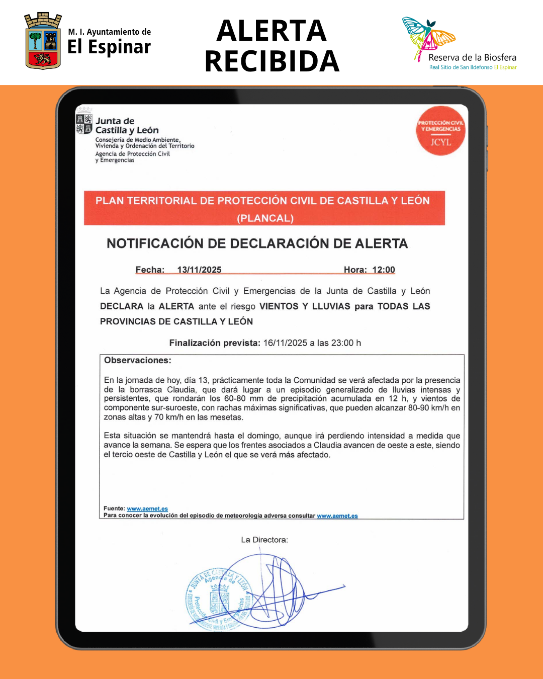 El Ayuntamiento de El Espinar informa, según la comunicación de la Agencia de Protección Civil y Emergencias de la Junta de Castilla y León, que se ha declarado ALERTA por vientos y lluvias en toda Castilla y León.