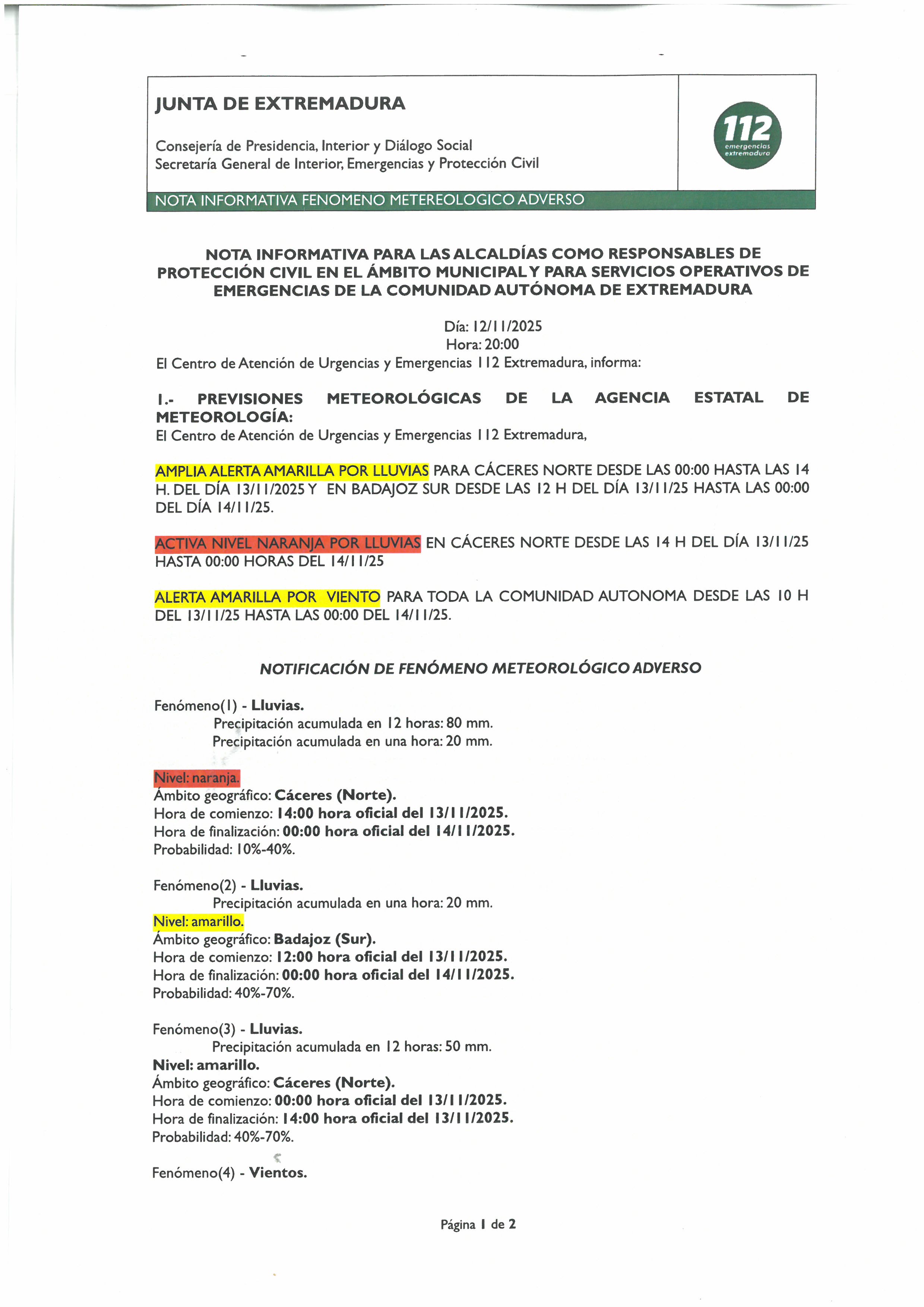El servicio 112 comunica que la alerta estará activa desde el jueves, 13 de noviembre de 2025, 14:00 h hasta el viernes, 14 de noviembre de 2025, 00:00 h (hora peninsular).