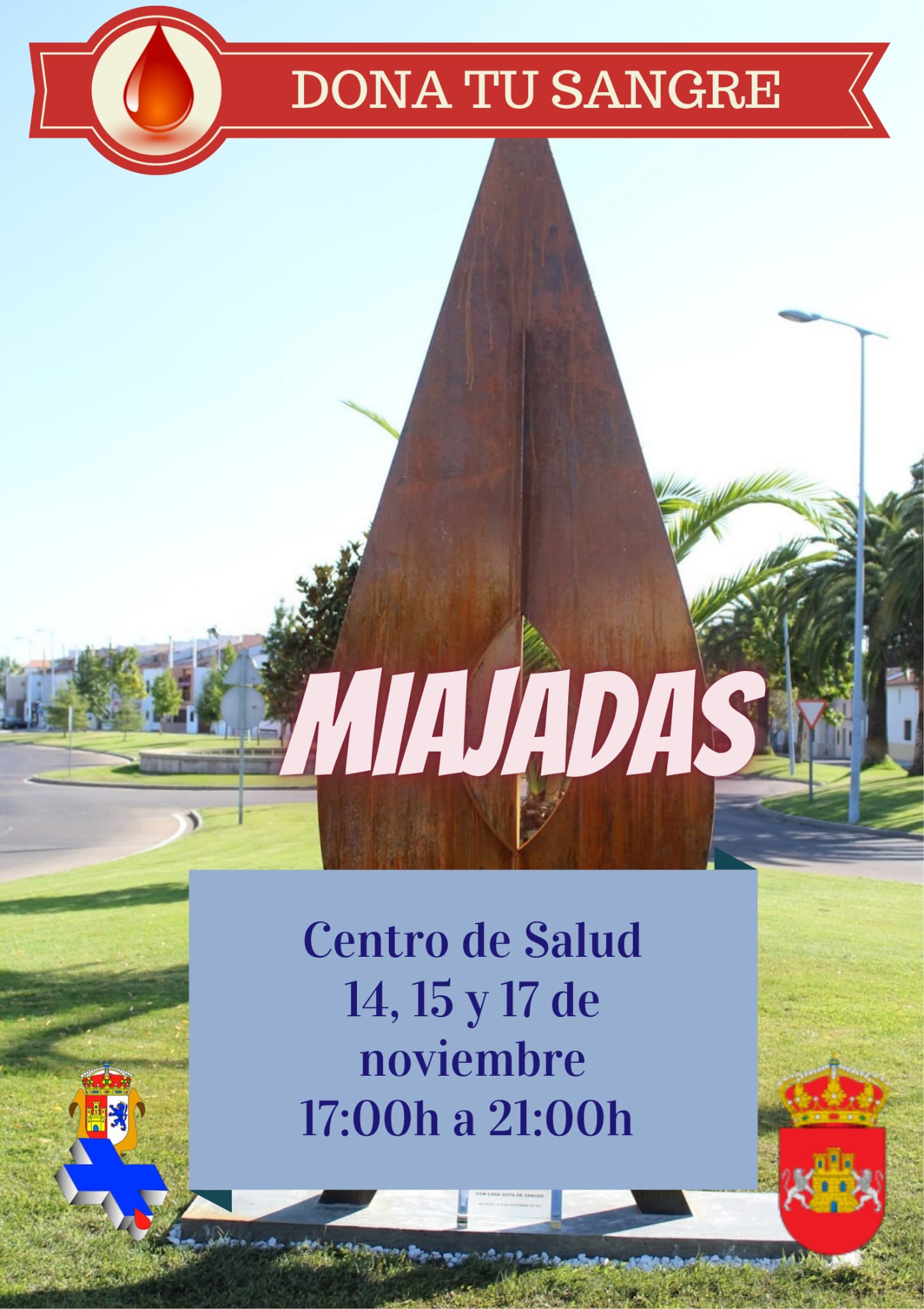 El Banco de Sangre de Extremadura estará en Miajadas los días 14, 15 y 17 de noviembre, en el Centro de Salud de Miajadas.Horario: De 17 a 21 horas.