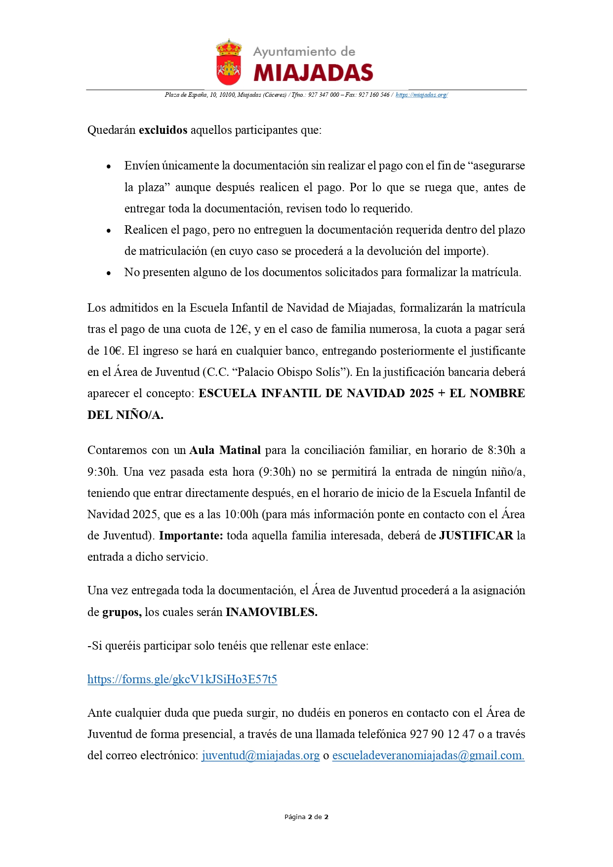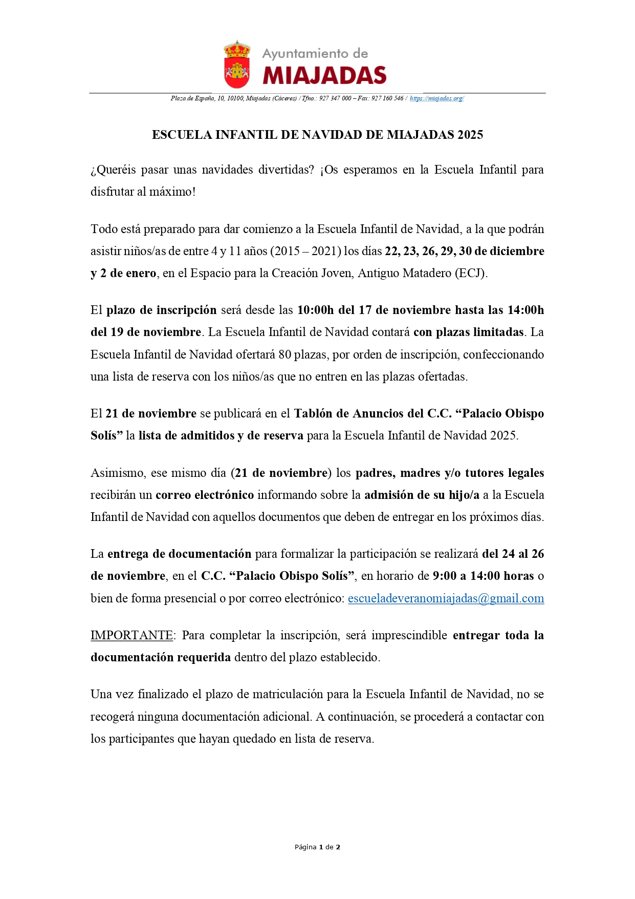 * La Escuela Infantil de Navidad contara con plazas limitadas, ofertándose 80 plazas, que serán ocupadas por orden de inscripción, confeccionándose una lista de reserva con los niños/as que no entren en dichas plazas.