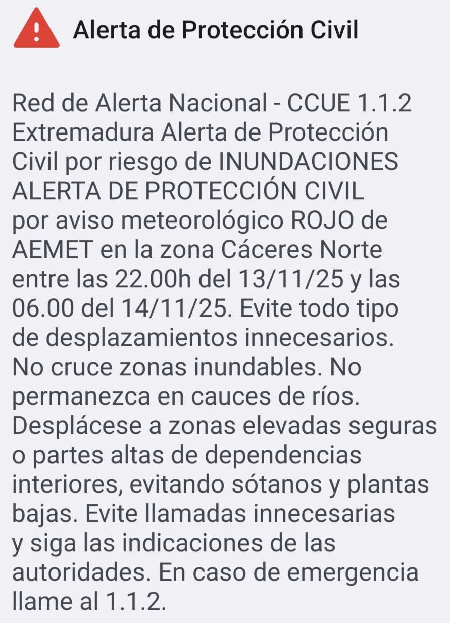 El 112 mantiene activo el aviso nivel ROJO por lluvias y vientos en la región del norte de Cáceres entre las 22:00h del día 13 de noviembre y las 06:00h del 14 de noviembre.