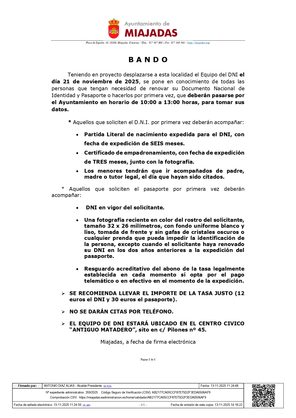 Aquellas personas que tengan que renovar o hacer por primera vez su Documento Nacional de Identidad o Pasaporte, ya pueden dirigirse al Ayuntamiento, de 10:00 a 13:00 horas, para tomar sus datos.