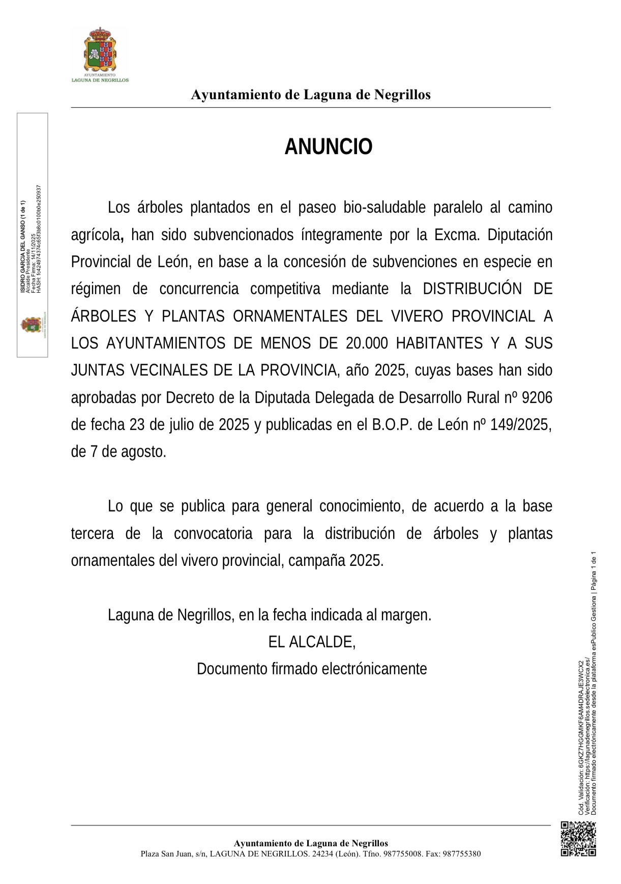 El Ayuntamiento de Laguna de Negrillos solicitó a la Diputación de León la donación de varios árboles de su vivero provincial para dotar espacios públicos de ajardinamiento. La resolución de dicha distribución de la institución provincial ha entregado 45 árboles de la campaña 2025 a Laguna de Negrillos.