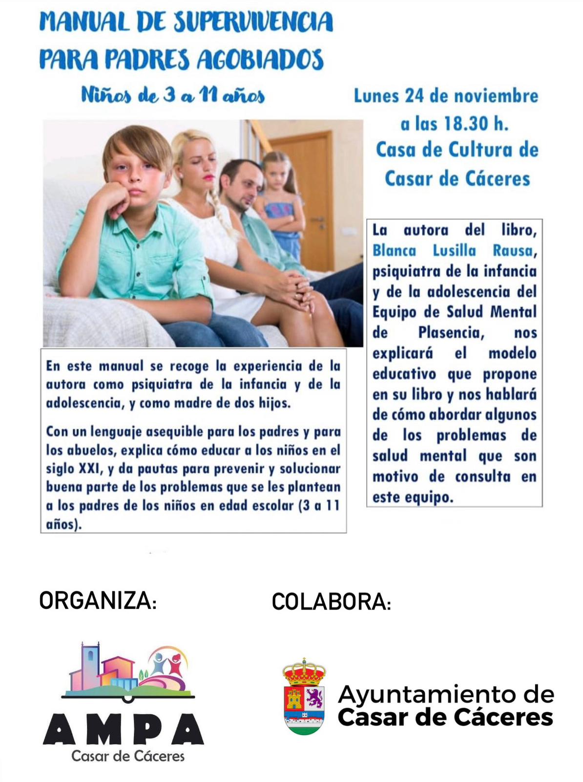 📢 La AMPA de Casar de Cáceres anima a participar en la presentación del libro «Manual de supervivencia para padres agobiados», de la autora Blanca Lusilla. La presentación tendrá lugar el lunes, 24 de noviembre, 18:30 h en la Casa de Cultura.