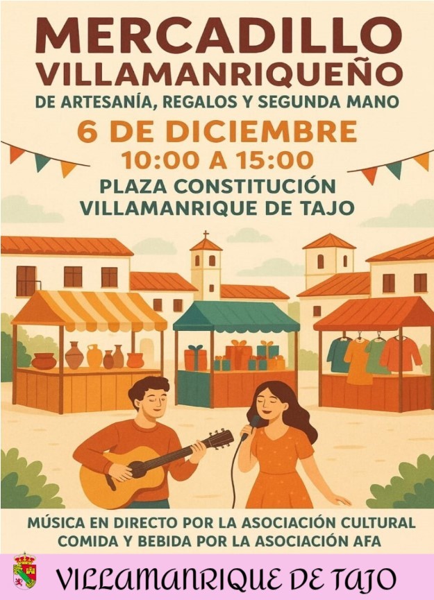 Mercadillo de artesanÃa, regalos y segunda mano.6 de Diciembre en la Plaza del ayuntamiento de 10:00 a 15:00 horas.Tendremos actuaciones a cargo de la Asociación Cultural.Comida y bebida a cargo del AFA.