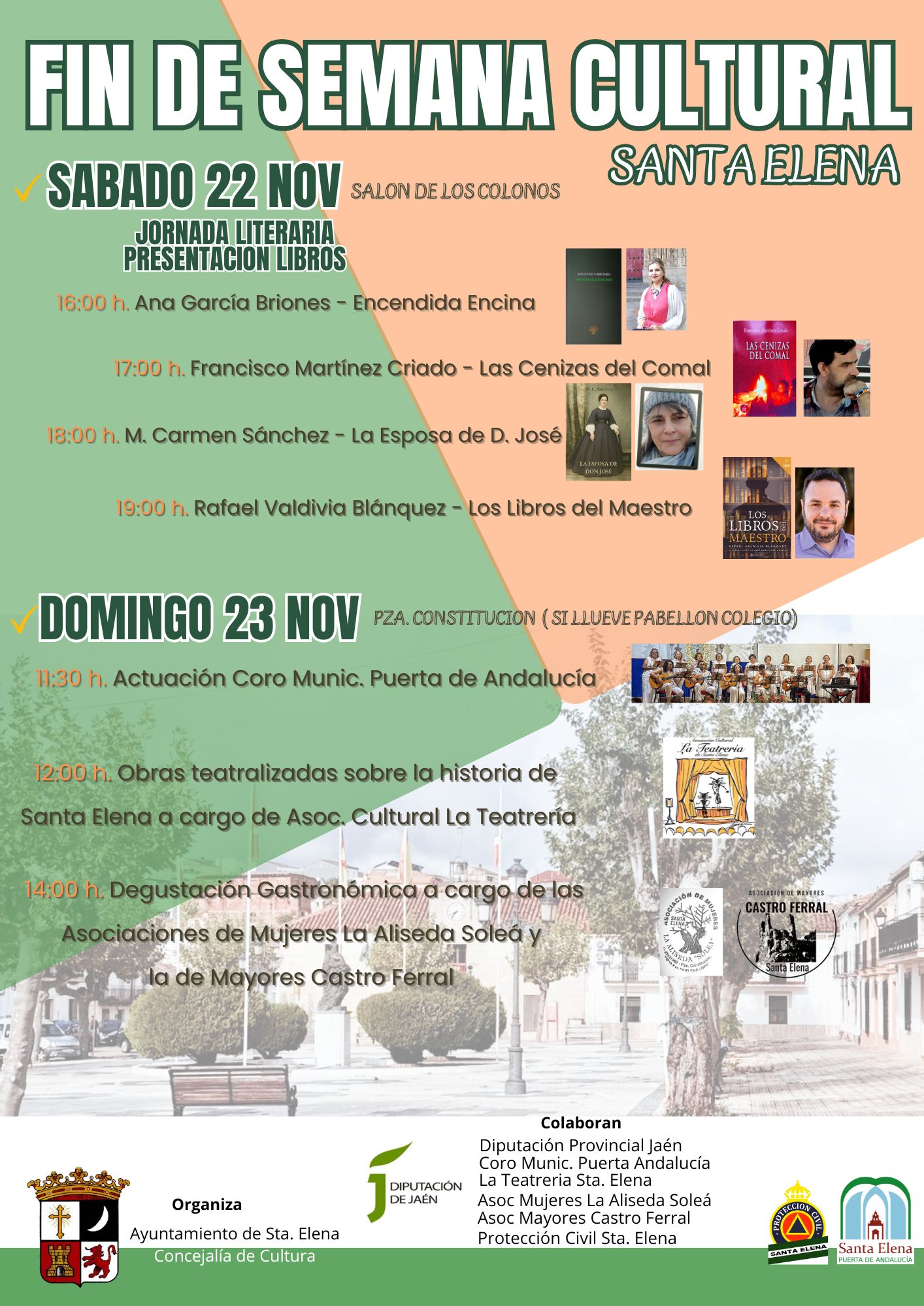 Para cerrar el Fin de Semana Cultural ,el Domingo 23 contaremos con la actuación de nuestro Coro Municipal Puerta de Andalucía y de una representación teatral a cargo de la Asociación Cultural La Teatreria sobre las diferentes épocas de nuestra historia local ,también disfrutaremos de una degustación gastronómica gracias a la colaboración de la Asociación de Mujeres La Aliseda Soleá y de la Asociación de Mayores Castro Ferral, la actividad está financiada por el Ayuntamiento de Santa Elena y la Exma. Diputación Provincial de Jaén.