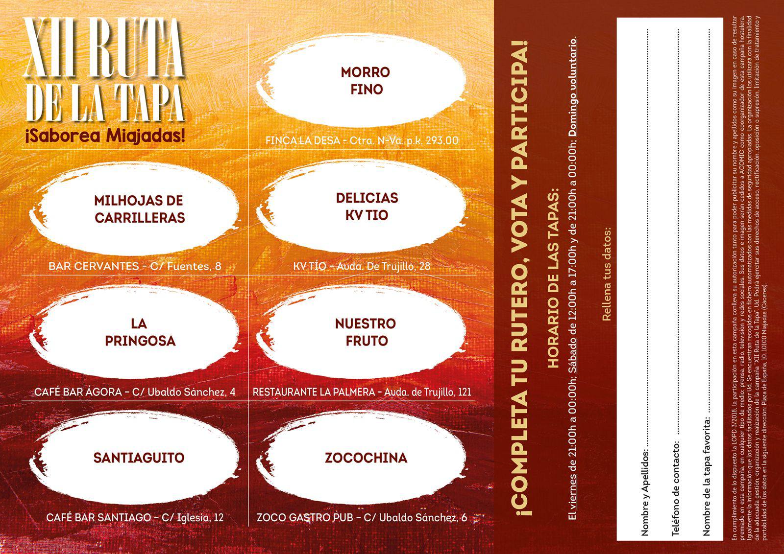 * Participan: Bar Cervantes, Café Bar Ágora, Café Bar Santiago, Finca La Desa, KV Tío, La Palmera Miajadas y Zoco Gastro Pub.