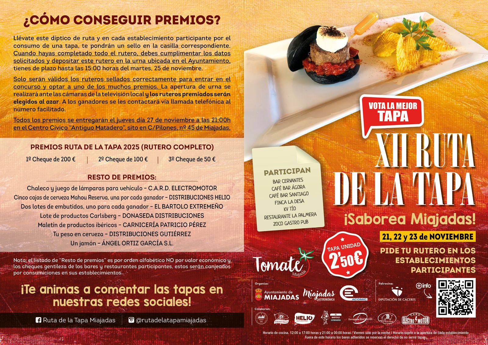 Recuerda que este fin de semana, de viernes a domingo, tenemos cita importante en Miajadas en torno a la 12ª edición de la Ruta de la Tapa. ¡Ya tenemos los dípticos en la calle!Pásate por cualquiera de los establecimientos participantes, hazte con tu Rutero y no olvides pedir tu sello por cada tapa que pruebes...