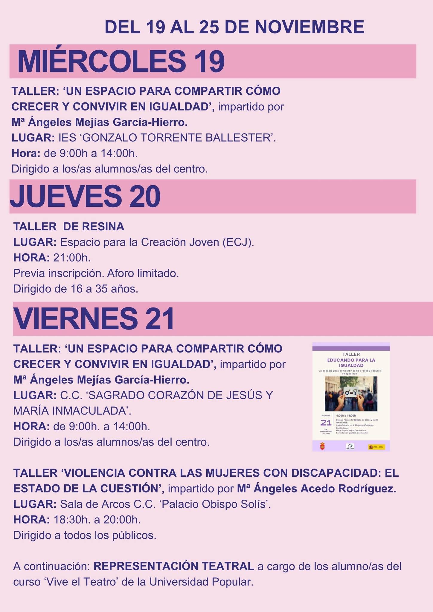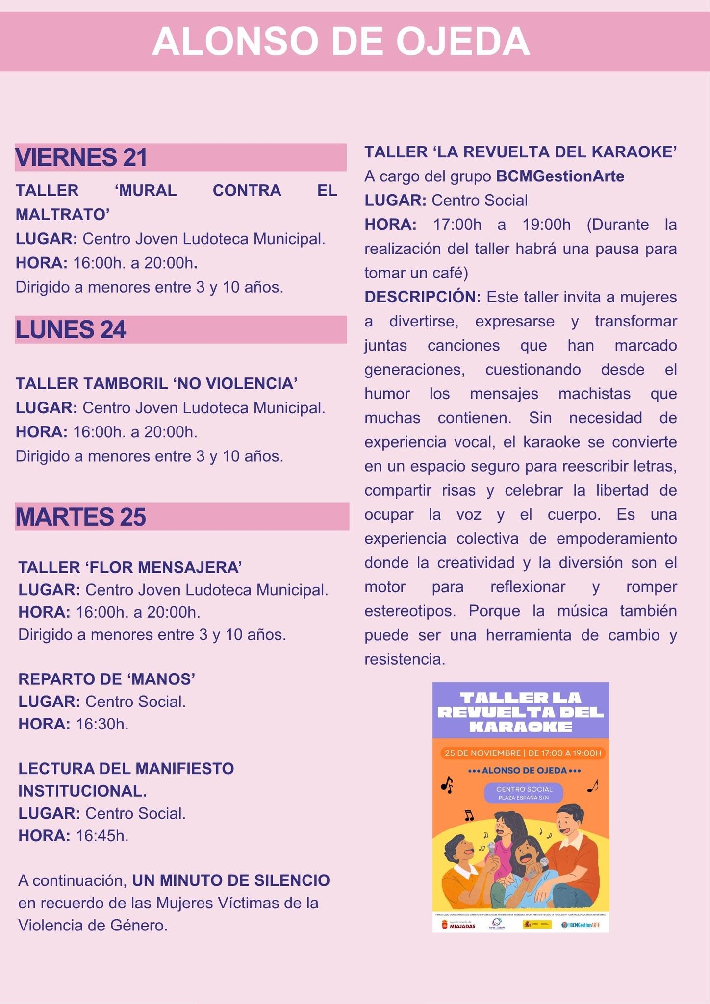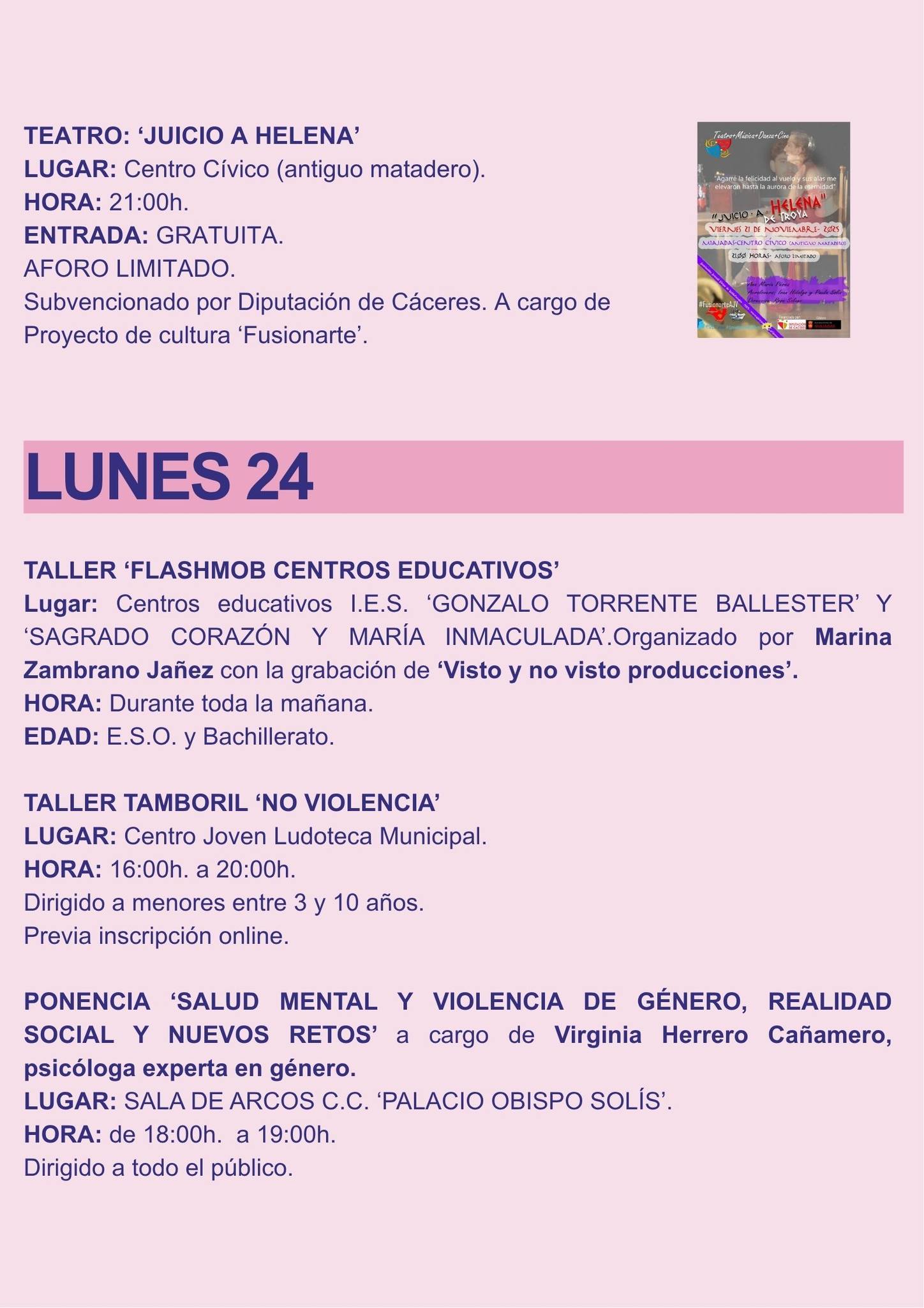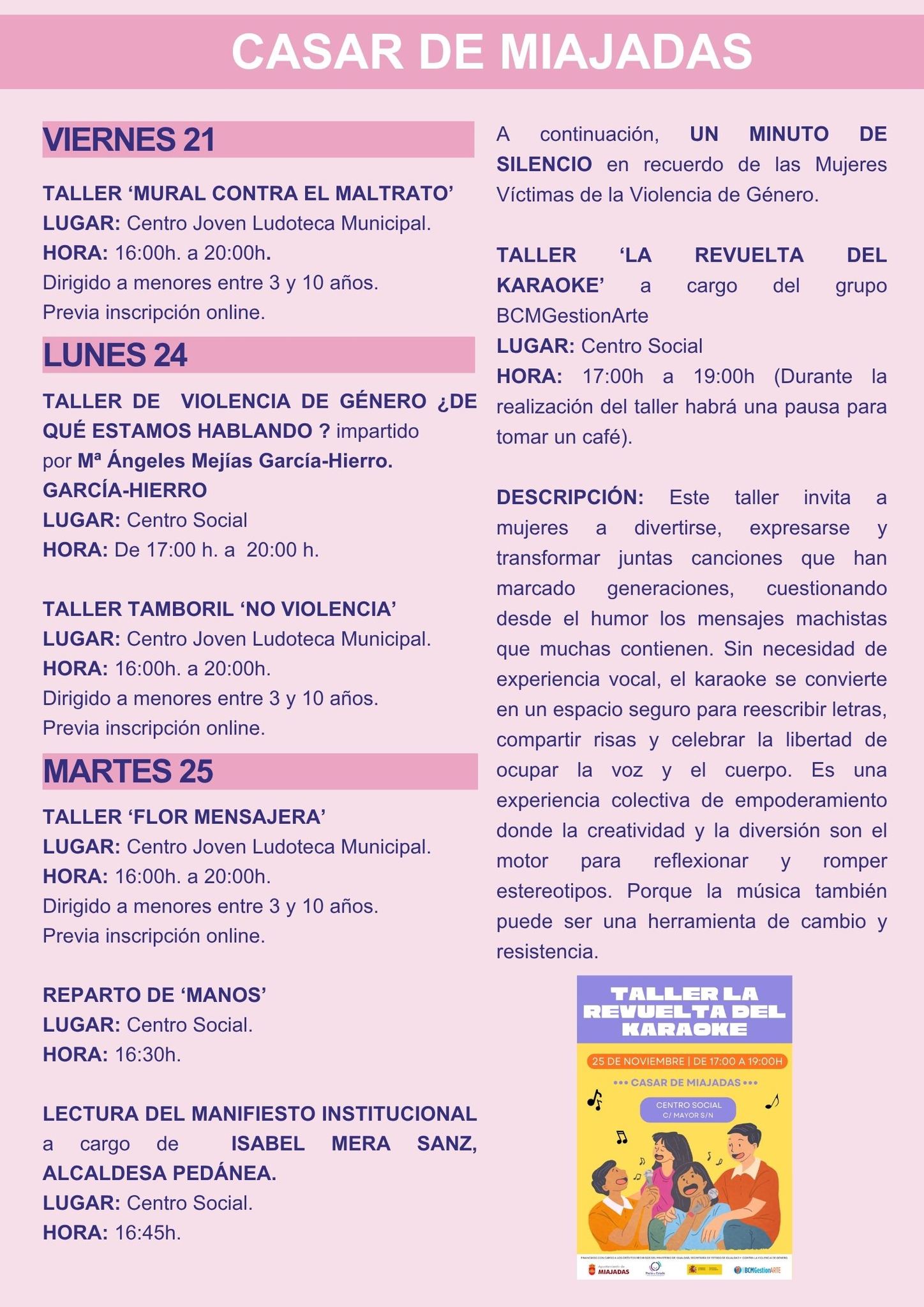 Arriba, adjunto en diferentes archivos, de nuevo la Programación con las actividades (con lugar de celebración, horarios y resto de información de interés) en torno a la conmemoración del Día Internacional de la Eliminación de la Violencia contra la Mujer en Miajadas, Alonso de Ojeda y Casar de Miajadas.