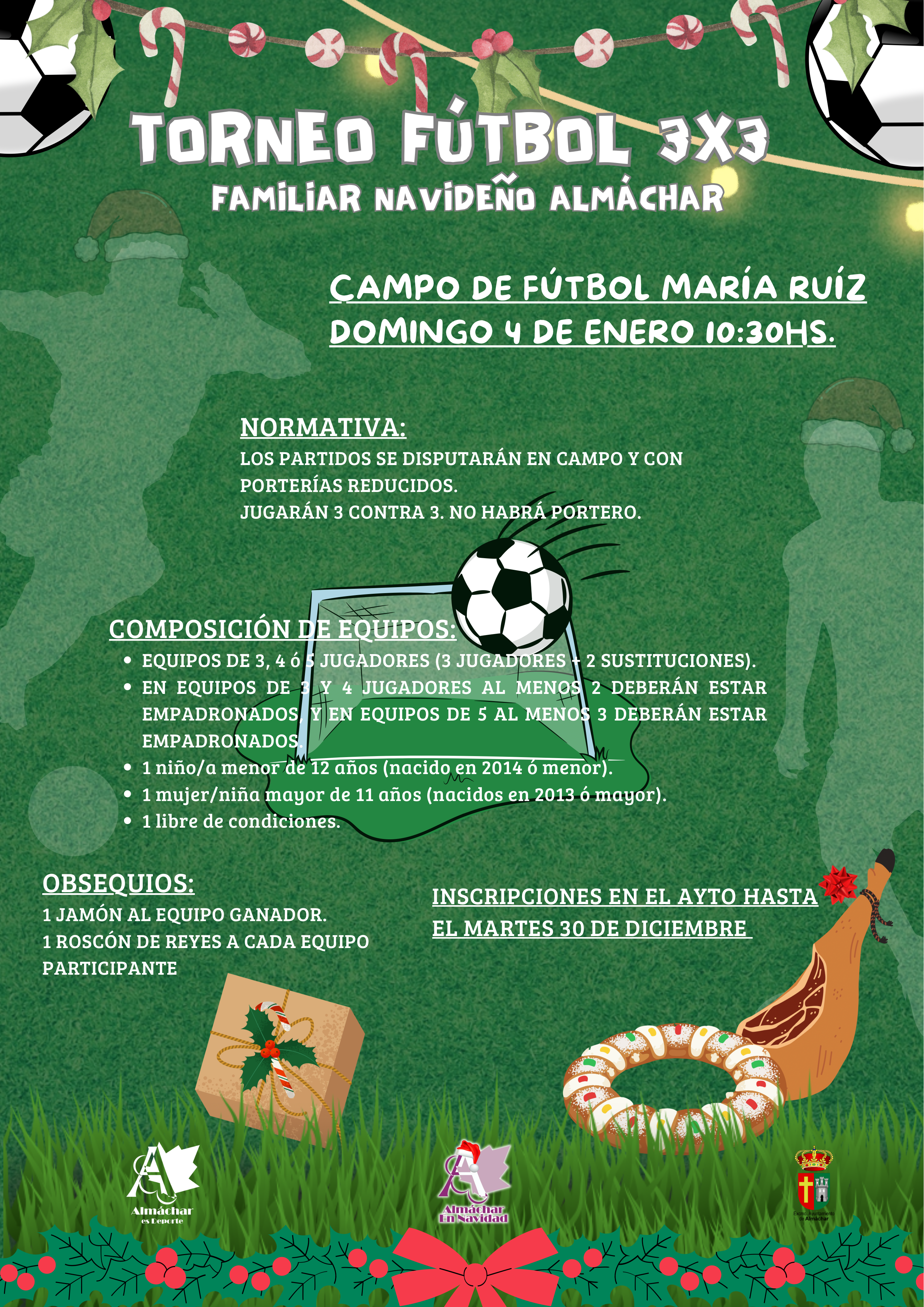 Si estáis pensando en participar en el Torneo de Fútbol 3x3 Familiar Navideño de Almáchar, aprovechad para organizar vuestro equipo y disfrutar juntos preparando la mañana deportiva que viviremos el domingo 4 de enero a las 10:30 h en el Campo de Fútbol María Ruiz.