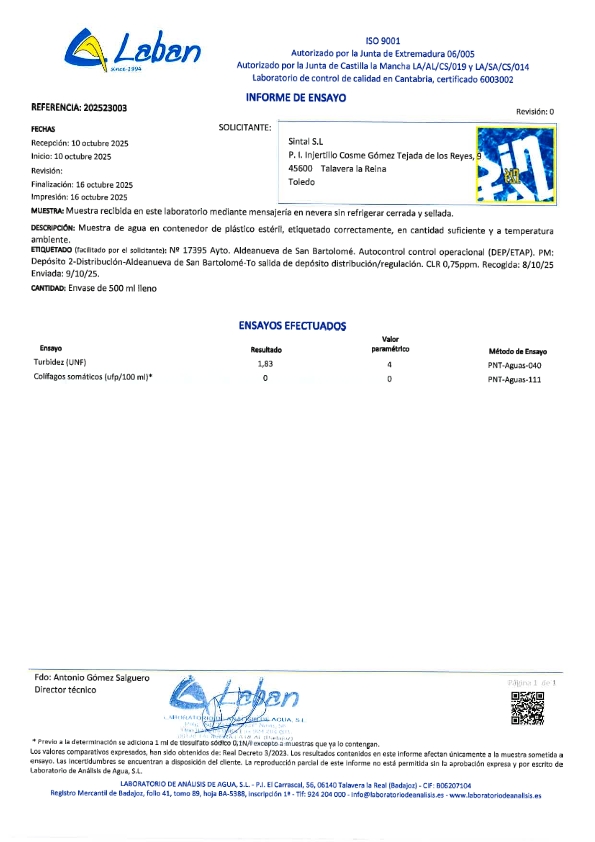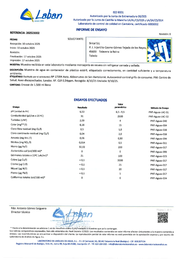 les adjuntamos el último informe de ensayo de la muestra del agua donde se indica especificado la potabilidad de esta en su llegada al depósito.