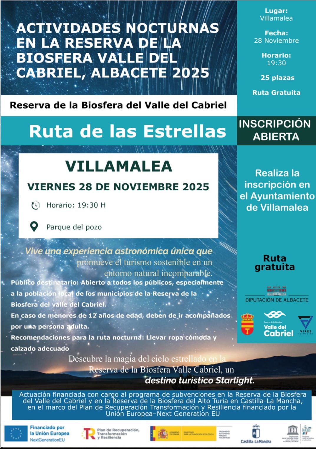 Vive una experiencia astronómica única el viernes 28 de noviembre a las 19:30 en el Parque del pozo se realizará una Actividad nocturna en la reserva de la Biosfera Valle del Cabriel, Albacete 2025.