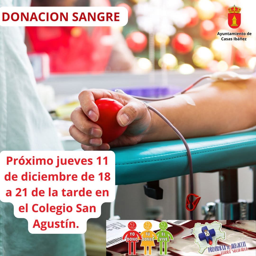 ℹ Información donación de sangre 🩸:El próximo jueves 11 de diciembre se desplazará hasta Casas Ibáñez la unidad móvil de donantes de sangre.Será en el CEIP San Agustín de 18 a 21 horas.
